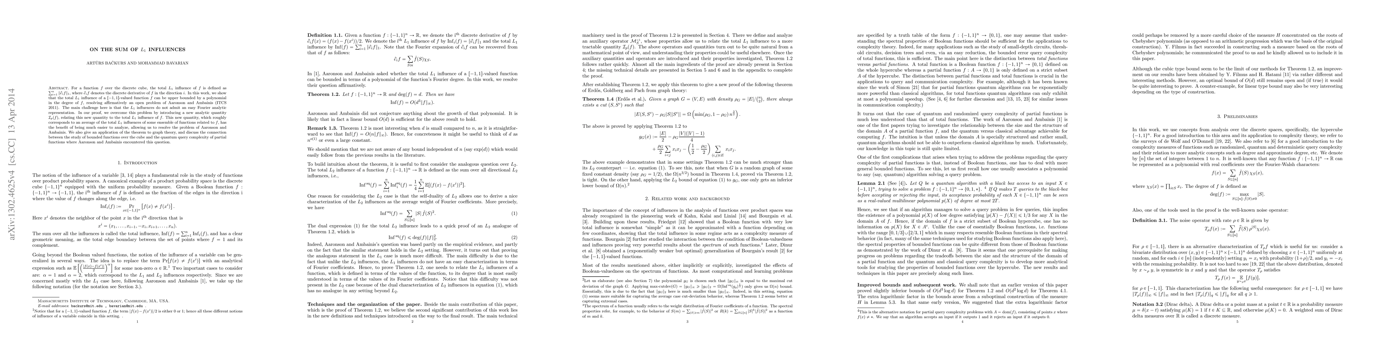 For a function $f$ over the discrete cube, the total $L_1$ influence of $f$ is defined as $\sum_{i=1}^n \|\partial_i f\|_1$, where $\partial_i f$ denotes the discrete derivative of $f$ in the direction $i$. In this work, we show that the total $L_1$ influence of a $[-1,1]$-valued function $f$ can be upper bounded by a polynomial in the degree of $f$, resolving affirmatively an open problem of Aaronson and Ambainis (ITCS 2011). The main challenge here is that the $L_1$ influences do not admit an easy Fourier analytic representation. In our proof, we overcome this problem by introducing a new analytic quantity $\mathcal I_p(f)$, relating this new quantity to the total $L_1$ influence of $f$. This new quantity, which roughly corresponds to an average of the total $L_1$ influences of some ensemble of functions related to $f$, has the benefit of being much easier to analyze, allowing us to resolve the problem of Aaronson and Ambainis. We also give an application of the theorem to graph theory, and discuss the connection between the study of bounded functions over the cube and the quantum query complexity of partial functions where Aaronson and Ambainis encountered this question.