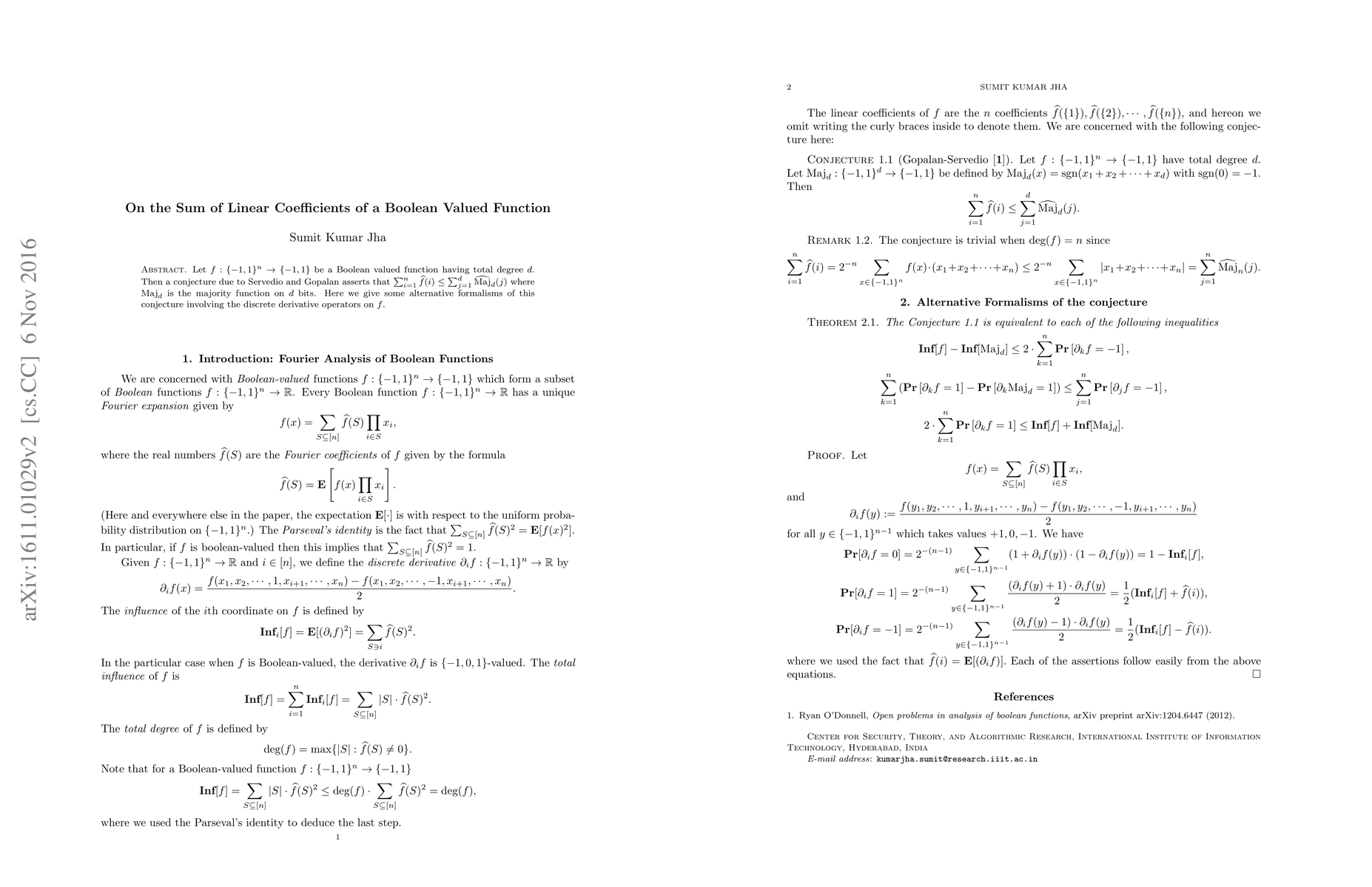 This paper presents alternative formulations of Servedio and Gopalan's conjecture concerning the sum of linear coefficients in Boolean valued functions of total degree d. The conjecture is explored through discrete derivative operators, offering new perspectives on the relationship between the function's coefficients and the majority function's Fourier coefficients.