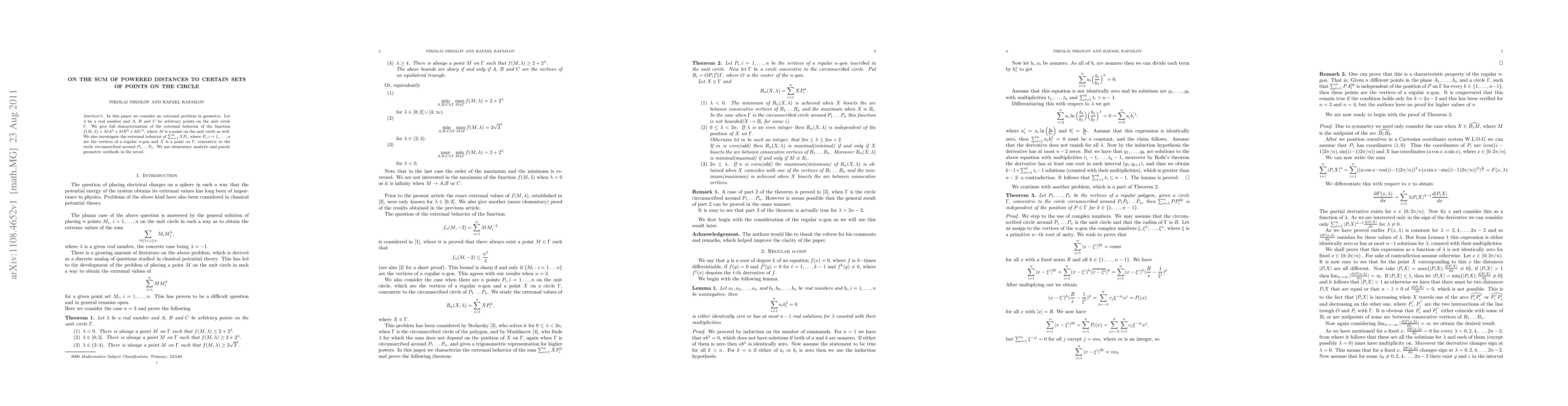 In this paper we consider an extremal problem in geometry. Let $\lambda$ be a real number and $A$, $B$ and $C$ be arbitrary points on the unit circle $\Gamma$. We give full characterization of the extremal behavior of the function $f(M,\lambda)=MA^\lambda+MB^\lambda+MC^\lambda$, where $M$ is a point on the unit circle as well. We also investigate the extremal behavior of $\sum_{i=1}^nXP_i$, where $P_i, i=1,...,n$ are the vertices of a regular $n$-gon and $X$ is a point on $\Gamma$, concentric to the circle circumscribed around $P_1...P_n$. We use elementary analytic and purely geometric methods in the proof.
