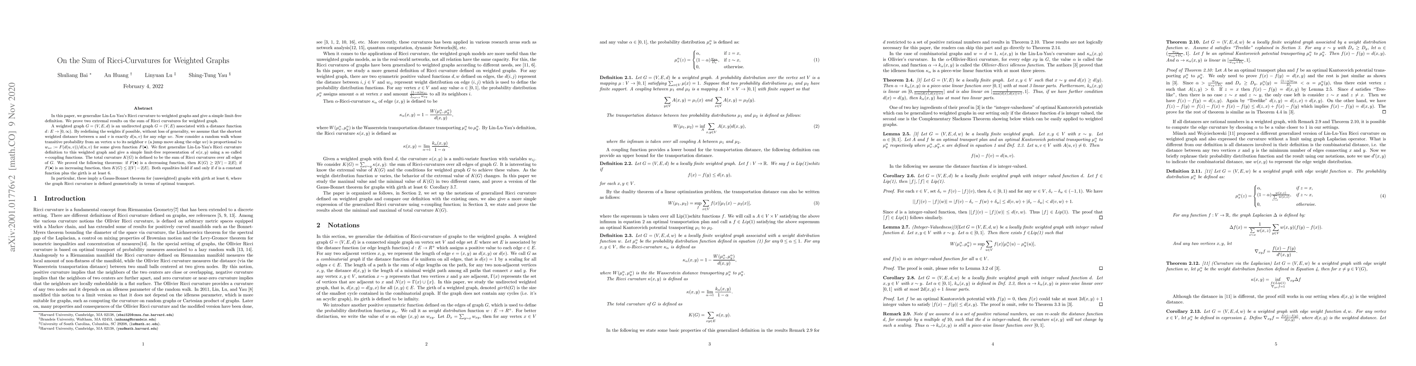 This paper generalizes Lin-Lu-Yau's Ricci curvature to weighted graphs, proving extremal results on the sum of Ricci curvatures. It establishes a Gauss-Bonnet theorem for unweighted graphs with girth at least 6, using optimal transport to define Ricci curvature geometrically.