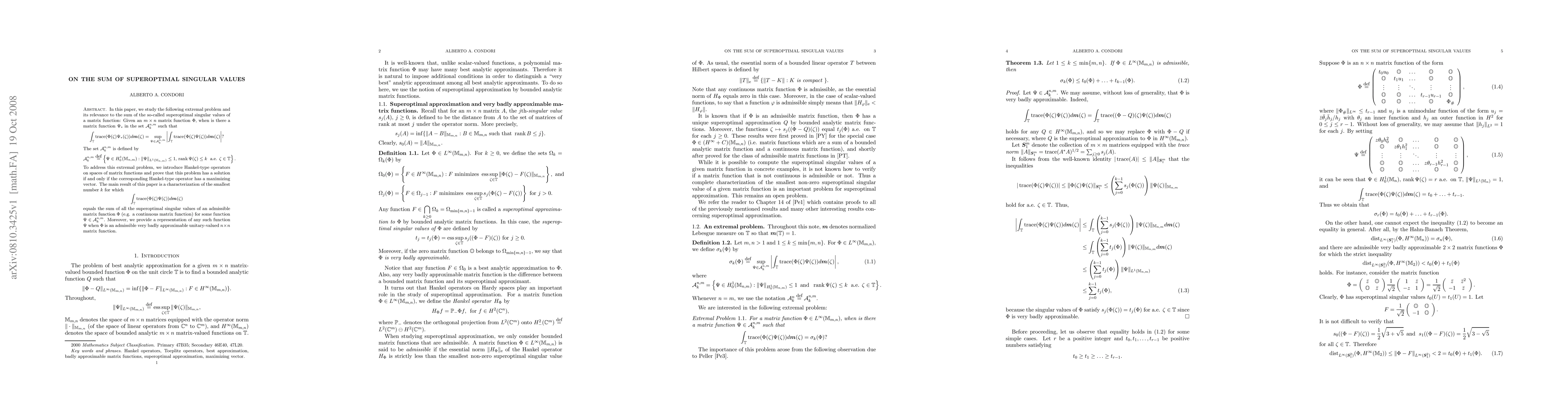 We discuss the following extremal problem and its relevance to the sum of the so-called superoptimal singular values of a matrix function: Given an $m\times n$ matrix function $\Phi$ on the unit circle $\mathbb{T}$, when is there a matrix function $\Psi_{*}$ in the set $A_{k}^{n,m}$ such that \int_{\mathbb{T}}{\rm trace}(\Phi(\zeta)\Psi_{*}(\zeta))dm(\zeta)=\sup_{\Psi\in A_{k}^{n,m}}|\int_{\mathbb{T}}{\rm trace}(\Phi(\zeta)\Psi(\zeta))dm(\zeta)|? The set $A_{k}^{n,m}$ is defined by A_{k}^{n,m}={\Psi\in H_{0}^{1}: \|\Psi\|_{L^{1}}\leq 1, {\rm rank}\Psi(\zeta)\leq k{a.e.}\zeta\in T}. We introduce Hankel-type operators on spaces of matrix functions and prove that this problem has a solution if and only if the corresponding Hankel-type operator has a maximizing vector. We also characterize the smallest number $k$ for which \int_{\mathbb{T}}{\rm trace}(\Phi(\zeta)\Psi(\zeta))dm(\zeta) equals the sum of all the superoptimal singular values of an admissible matrix function $\Phi$ for some $\Psi\in A_{k}^{n,m}$. Moreover, we provide a representation of any such function $\Psi$ when $\Phi$ is an admissible very badly approximable unitary-valued $n\times n$ matrix function.