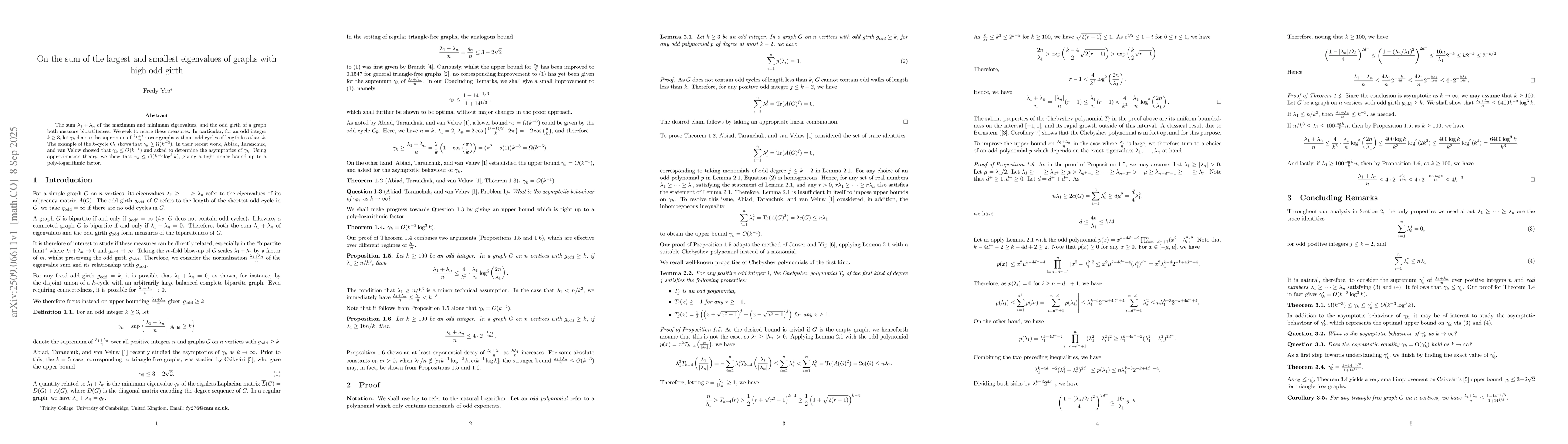 The sum $\lambda_1 + \lambda_n$ of the maximum and minimum eigenvalues, and the odd girth of a graph both measure bipartiteness. We seek to relate these measures. In particular, for an odd integer $k\geq 3$, let $\gamma_k$ denote the supremum of $\frac{\lambda_1 + \lambda_n}{n}$ over graphs without odd cycles of length less than $k$. The example of the $k$-cycle $C_k$ shows that $\gamma_k\geq \Omega(k^{-3})$. In their recent work, Abiad, Taranchuk, and van Veluw showed that $\gamma_k\leq O(k^{-1})$ and asked to determine the asymptotics of $\gamma_k$. Using approximation theory, we show that $\gamma_k\leq O(k^{-3}\log^3 k)$, giving a tight upper bound up to a poly-logarithmic factor.