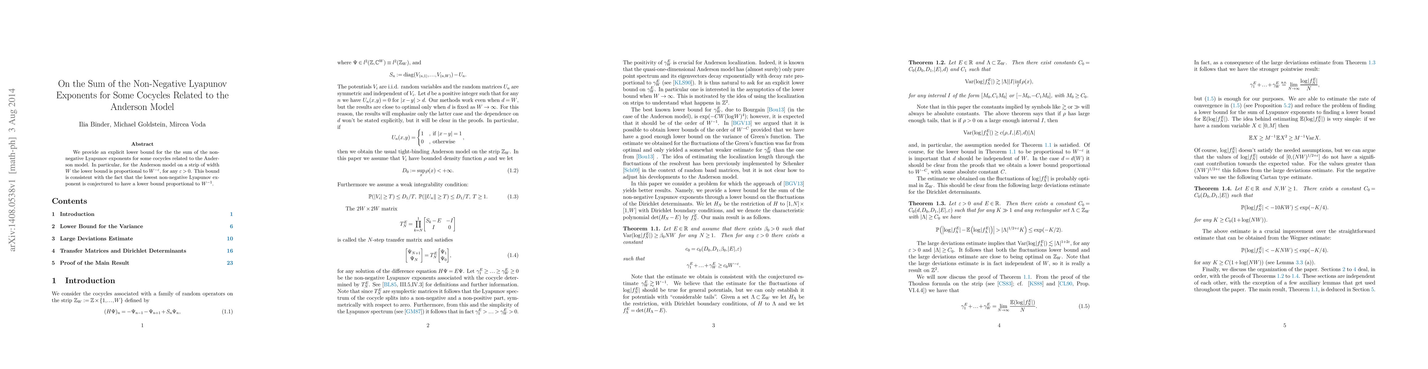 We provide an explicit lower bound for the the sum of the non-negative Lyapunov exponents for some cocycles related to the Anderson model. In particular, for the Anderson model on a strip of width $ W $ the lower bound is proportional to $ W^{-\epsilon} $, for any $ \epsilon>0 $. This bound is consistent with the fact that the lowest non-negative Lyapunov exponent is conjectured to have a lower bound proportional to $ W^{-1} $.