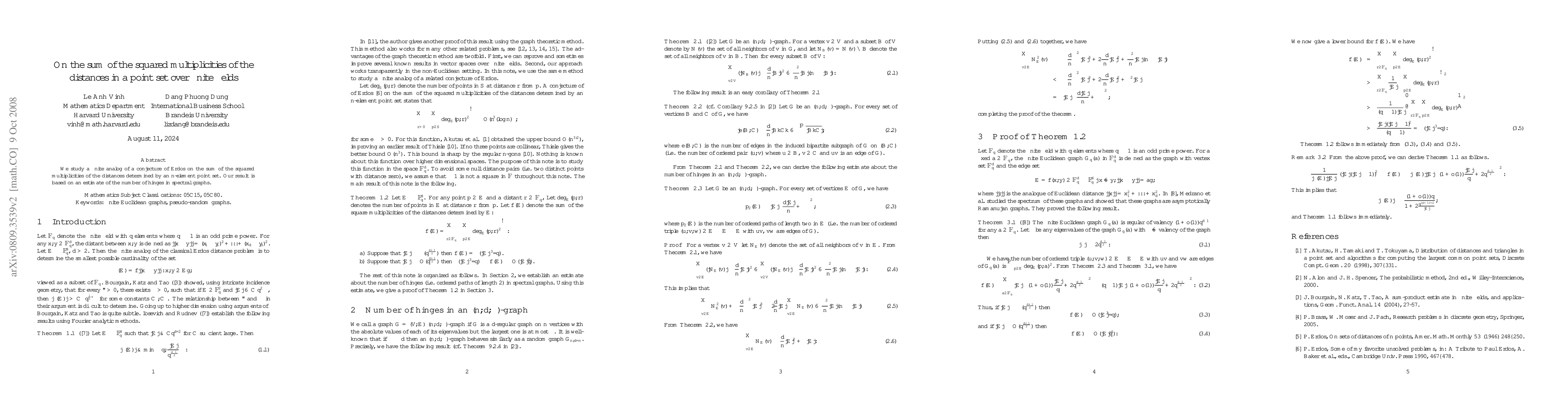 We study a finite analog of a conjecture of Erd\"os on the sum of the squared multiplicities of the distances determined by an $n$-element point set. Our result is based on an estimate of the number of hinges in spectral graphs.