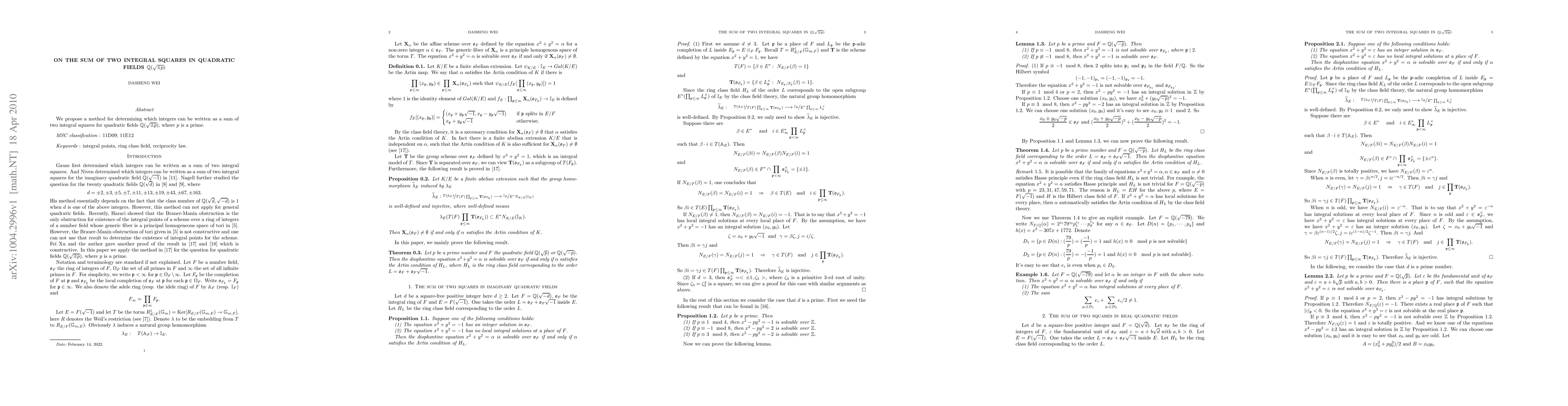 Summary: This paper introduces a novel approach to identify integers expressible as the sum of two integral squares within quadratic fields $\Q(\sqrt{\pm p})$, focusing on the prime $p$. The method provides insights into the algebraic structure of these fields.