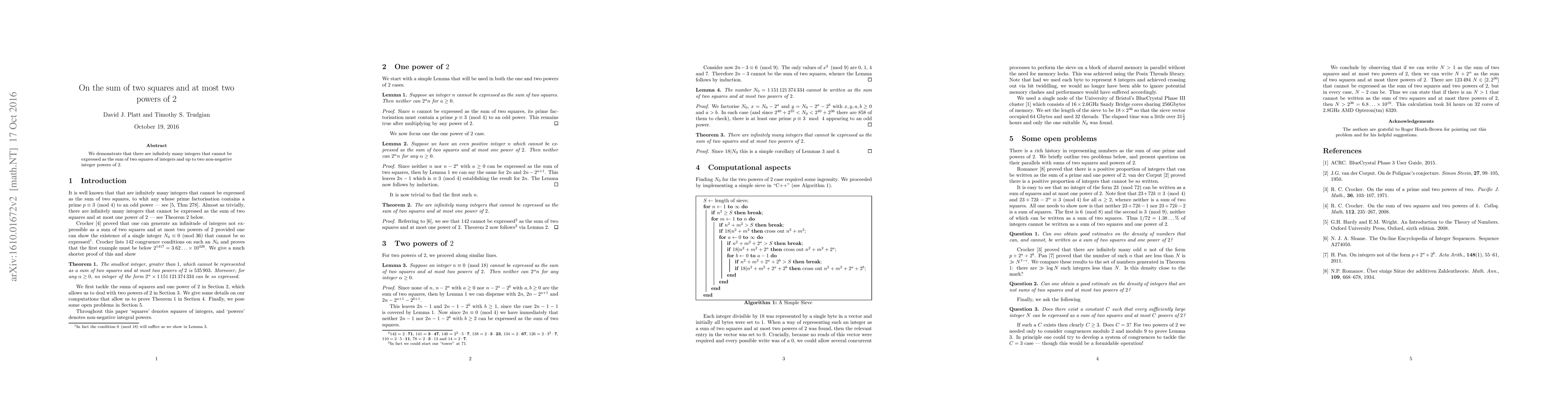 We demonstrate that there are infinitely many integers that cannot be expressed as the sum of two squares of integers and up to two non-negative integer powers of 2.