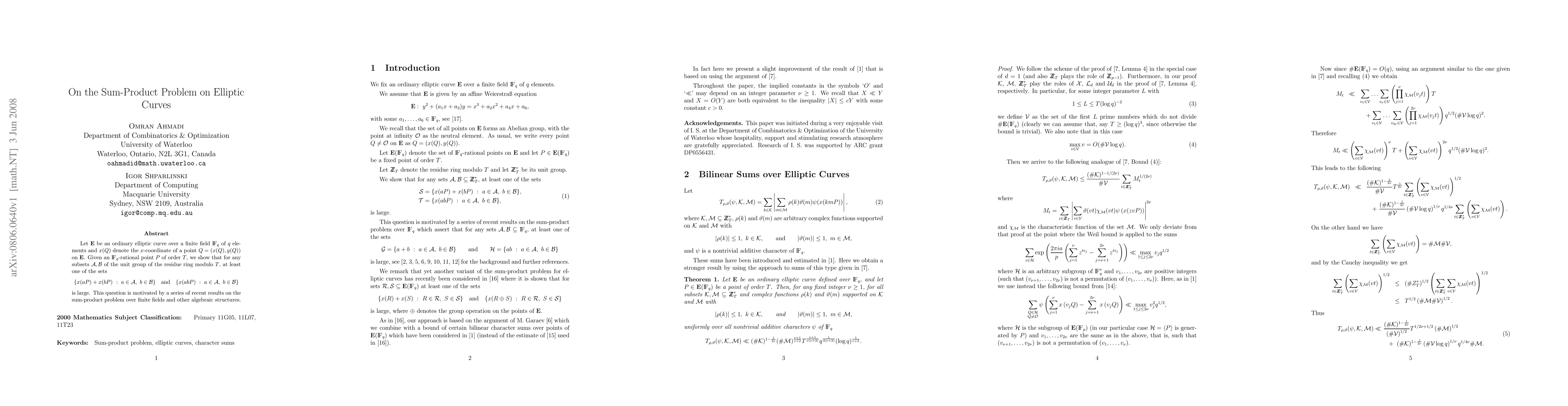 Let $\E$ be an ordinary elliptic curve over a finite field $\F_{q}$ of $q$ elements and $x(Q)$ denote the $x$-coordinate of a point $Q = (x(Q),y(Q))$ on $\E$. Given an $\F_q$-rational point $P$ of order $T$, we show that for any subsets $\cA, \cB$ of the unit group of the residue ring modulo $T$, at least one of the sets $$ \{x(aP) + x(bP) : a \in \cA, b \in \cB\} \quad\text{and}\quad \{x(abP) : a \in \cA, b \in \cB\} $$ is large. This question is motivated by a series of recent results on the sum-product problem over finite fields and other algebraic structures.