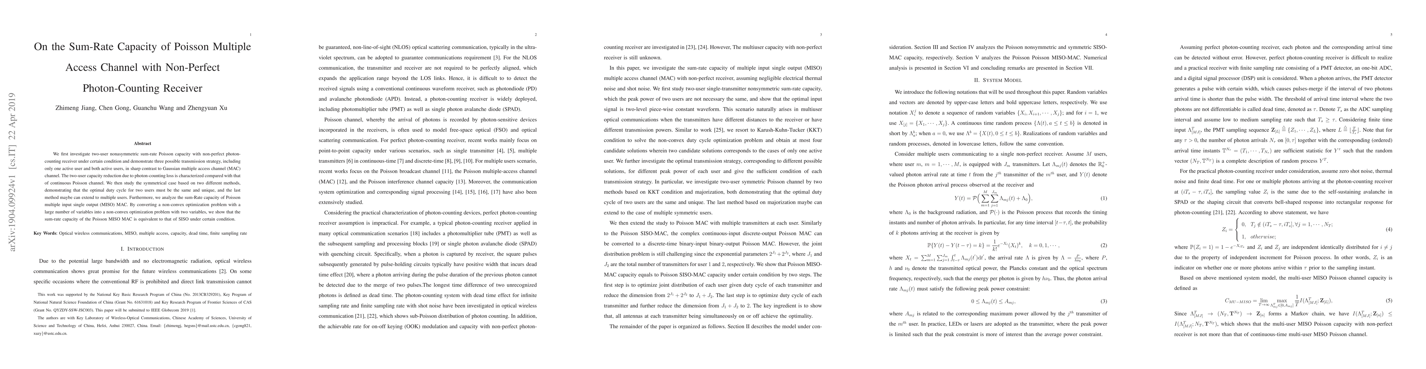We first investigate two-user nonasymmetric sum-rate Poisson capacity with non-perfect photoncounting receiver under certain condition and demonstrate three possible transmission strategy, including only one active user and both active users, in sharp contrast to Gaussian multiple access channel (MAC) channel. The two-user capacity reduction due to photon-counting loss is characterized compared with that of continuous Poisson channel. We then study the symmetrical case based on two different methods, demonstrating that the optimal duty cycle for two users must be the same and unique, and the last method maybe can extend to multiple users. Furthermore, we analyze the sum-Rate capacity of Poisson multiple input single output (MISO) MAC. By converting a non-convex optimization problem with a large number of variables into a non-convex optimization problem with two variables, we show that the sum-rate capacity of the Poisson MISO MAC is equivalent to that of SISO under certain condition.