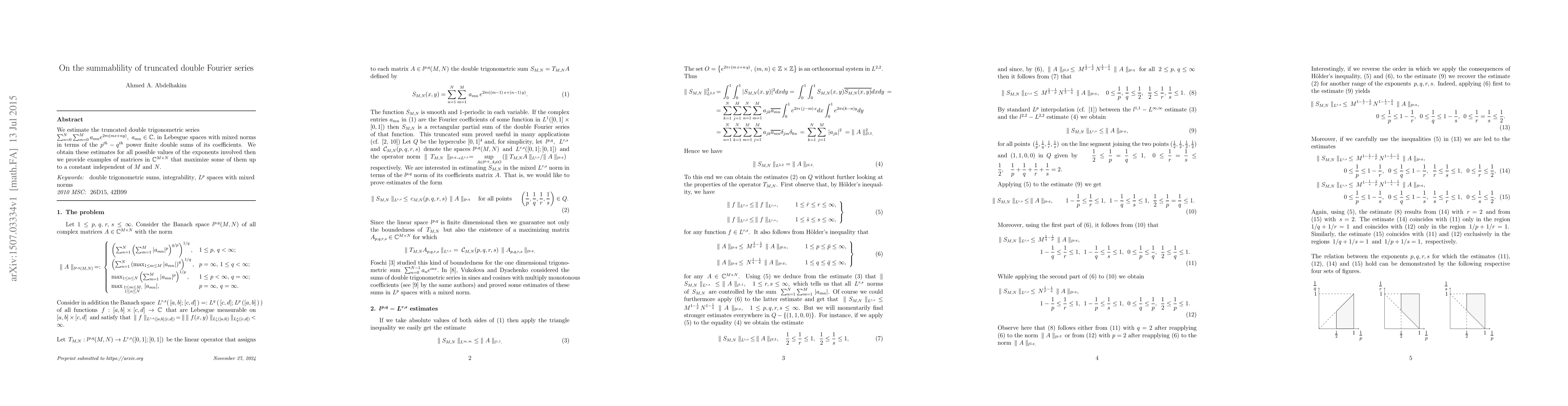 We estimate the truncated double trigonometric series $\sum_{n=0}^{N}\sum_{m=0}^{M}a_{mn} {e}^{2\pi \imath \left(m x+n y\right)}$, $a_{mn} \in\mathbb{C}$, in Lebesgue spaces with mixed norms in terms of the $p^{th}-q^{th}$ power finite double sums of its coefficients. We obtain these estimates for all possible values of the exponents involved then we provide examples of matrices in ${\mathbb{C}}^{M\times N}$ that maximize some of them up to a constant independent of $M$ and $N$.