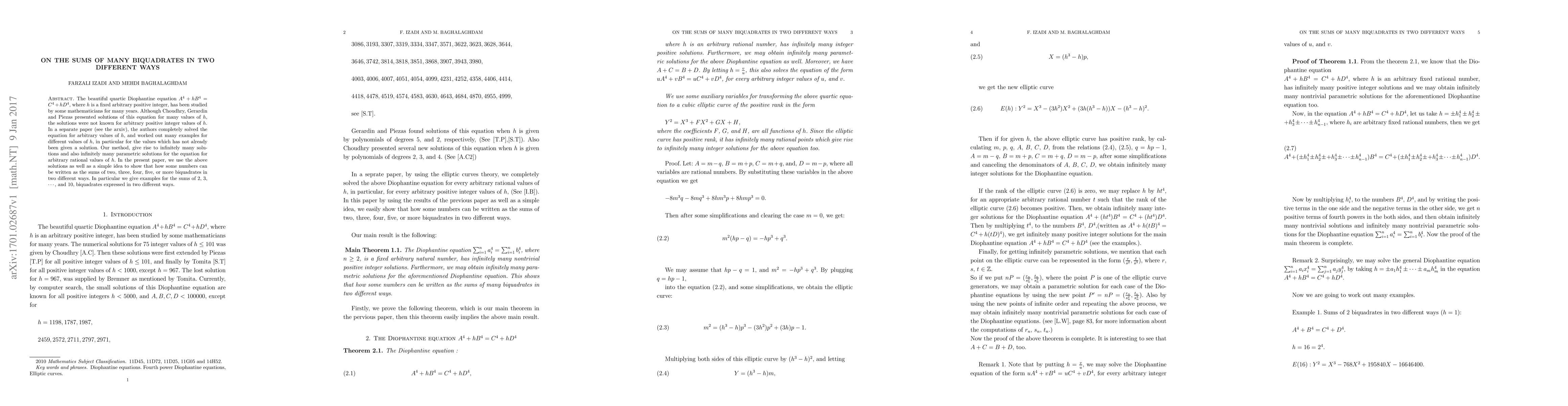 The beautiful quartic Diophantine equation $A^4+hB^4=C^4+hD^4$, where $h$ is a fixed arbitrary positive integer, has been studied by some mathematicians for many years. Although Choudhry, Gerardin and Piezas presented solutions of this equation for many values of $h$, the solutions were not known for arbitrary positive integer values of $h$. In a separate paper (see the arxiv), the authors completely solved the equation for arbitrary values of $h$, and worked out many examples for different values of $h$, in particular for the values which has not already been given a solution. Our method, give rise to infinitely many solutions and also infinitely many parametric solutions for the equation for arbitrary rational values of $h$. In the present paper, we use the above solutions as well as a simple idea to show that how some numbers can be written as the sums of two, three, four, five, or more biquadrates in two different ways. In particular we give examples for the sums of $2$, $3$, $\cdots$, and $10$, biquadrates expressed in two different ways.