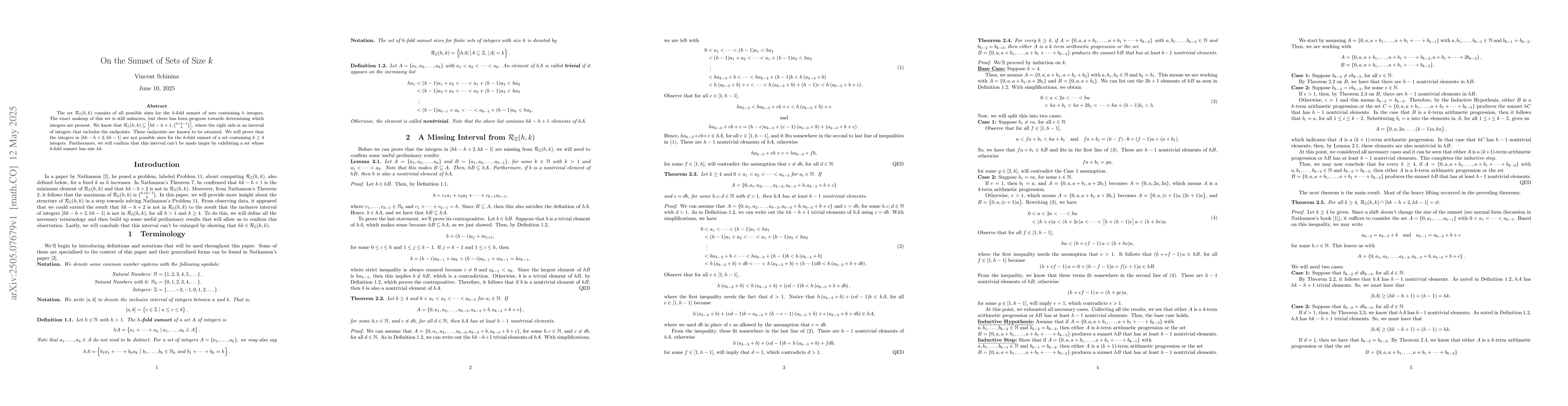 The paper presents a proof that certain integer intervals cannot represent sumset sizes, thereby narrowing the range of possible sumset cardinalities for $h$-fold sums of $k$-element sets.