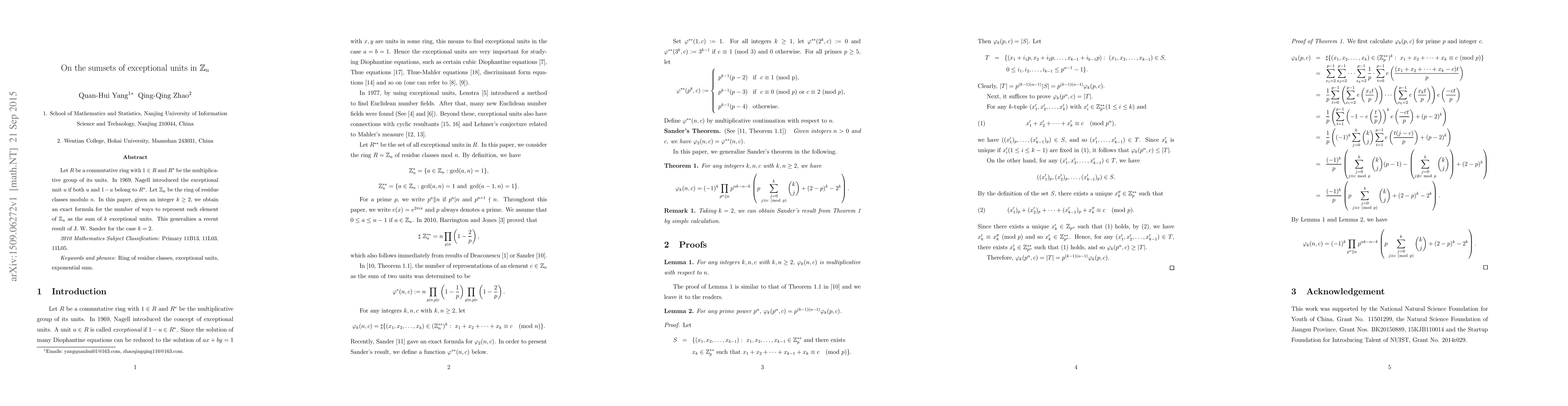 Let $R$ be a commutative ring with $1\in R$ and $R^{\ast}$ be the multiplicative group of its units. In 1969, Nagell introduced the exceptional unit $u$ if both $u$ and $1-u$ belong to $R^{\ast}$. Let $\mathbb{Z}_n$ be the ring of residue classes modulo $n$. In this paper, given an integer $k\ge 2$, we obtain an exact formula for the number of ways to represent each element of $ \mathbb{Z}_n$ as the sum of $k$ exceptional units. This generalizes a recent result of J. W. Sander for the case $k=2$.