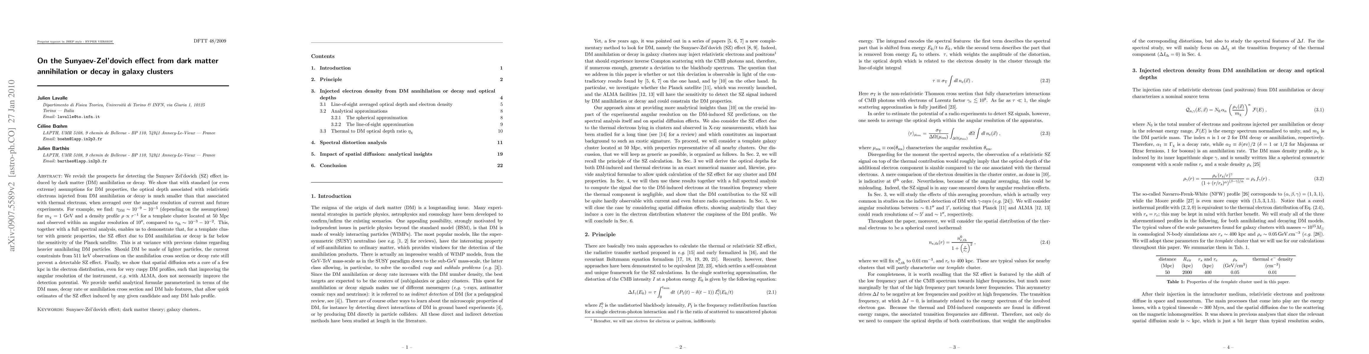We revisit the prospects for detecting the Sunyaev Zel'dovich (SZ) effect induced by dark matter (DM) annihilation or decay. We show that with standard (or even extreme) assumptions for DM properties, the optical depth associated with relativistic electrons injected from DM annihilation or decay is much smaller than that associated with thermal electrons, when averaged over the angular resolution of current and future experiments. For example, we find: $\tau_{\rm DM} \sim 10^{-9}-10^{-5}$ (depending on the assumptions) for $\mchi = 1$ GeV and a density profile $\rho\propto r^{-1}$ for a template cluster located at 50 Mpc and observed within an angular resolution of $10"$, compared to $\tau_{\rm th}\sim 10^{-3}-10^{-2}$. This, together with a full spectral analysis, enables us to demonstrate that, for a template cluster with generic properties, the SZ effect due to DM annihilation or decay is far below the sensitivity of the Planck satellite. This is at variance with previous claims regarding heavier annihilating DM particles. Should DM be made of lighter particles, the current constraints from 511 keV observations on the annihilation cross section or decay rate still prevent a detectable SZ effect. Finally, we show that spatial diffusion sets a core of a few kpc in the electron distribution, even for very cuspy DM profiles, such that improving the angular resolution of the instrument, e.g. with ALMA, does not necessarily improve the detection potential. We provide useful analytical formulae parameterized in terms of the DM mass, decay rate or annihilation cross section and DM halo features, that allow quick estimates of the SZ effect induced by any given candidate and any DM halo profile.