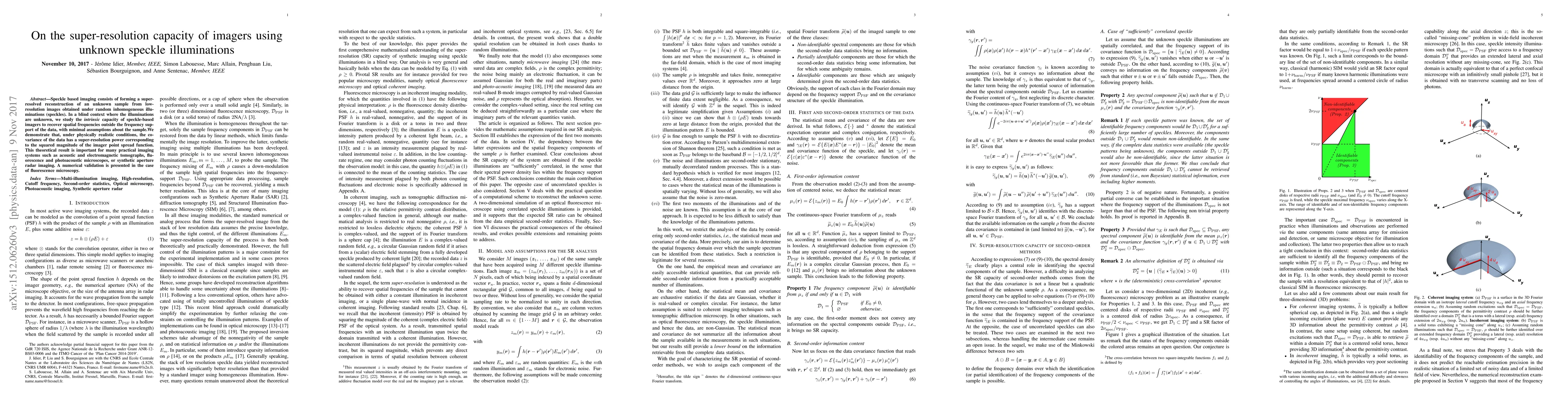 This paper explores the super-resolution capabilities of speckle-based imaging systems under unknown illumination conditions, demonstrating that the data covariance can achieve super-resolution proportional to the squared magnitude of the imager's point spread function. Numerical validation in fluorescence microscopy supports the theoretical findings.