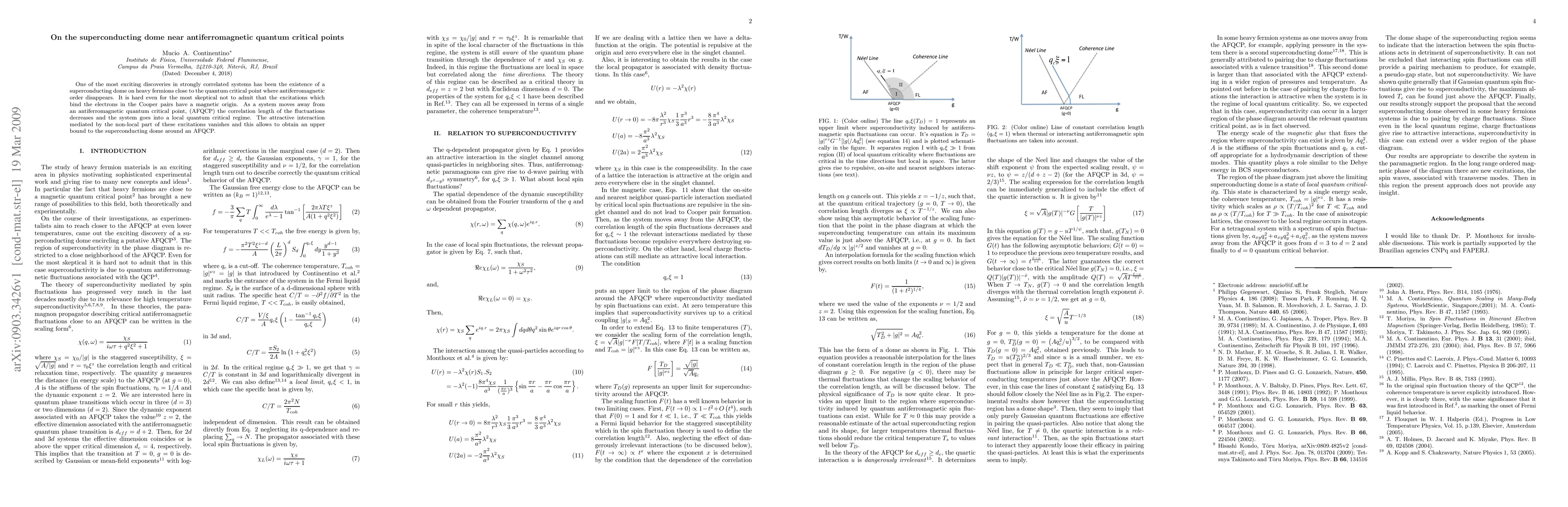 This paper explores the superconducting dome in heavy fermions near antiferromagnetic quantum critical points, suggesting that magnetic excitations play a key role in forming Cooper pairs. As the system moves away from the critical point, the correlation length of fluctuations decreases, leading to a local quantum critical regime and an upper bound to the superconducting dome.