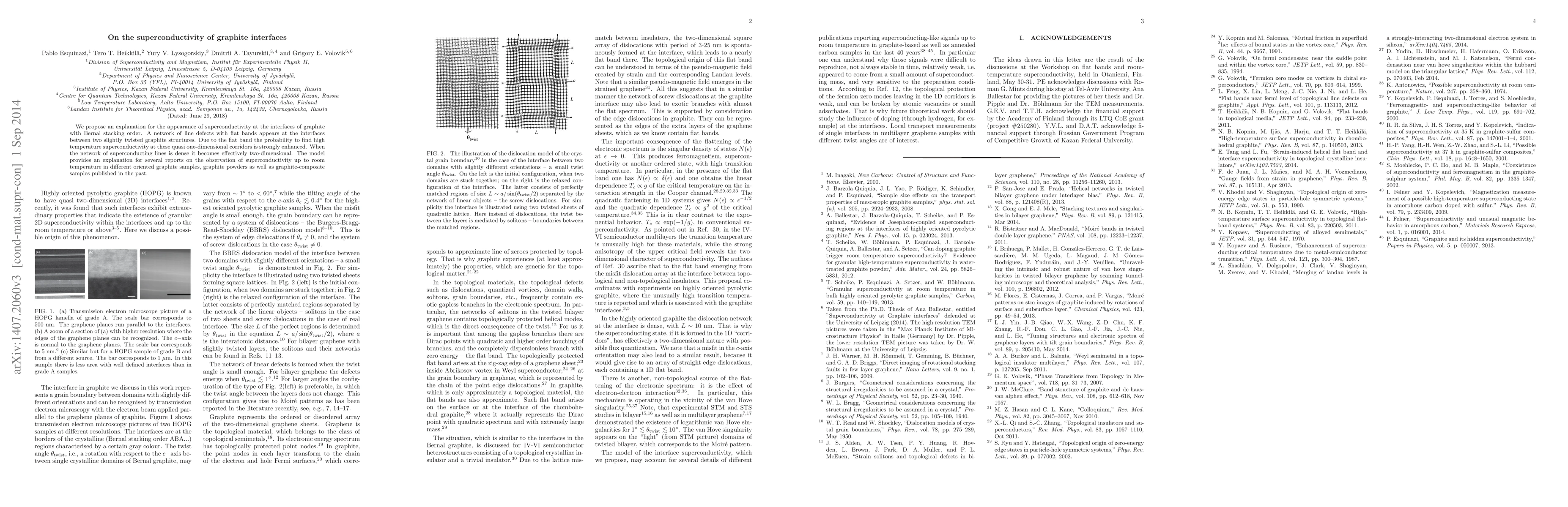 We propose an explanation for the appearance of superconductivity at the interfaces of graphite with Bernal stacking order. A network of line defects with flat bands appears at the interfaces between two slightly twisted graphite structures. Due to the flat band the probability to find high temperature superconductivity at these quasi one-dimensional corridors is strongly enhanced. When the network of superconducting lines is dense it becomes effectively two-dimensional. The model provides an explanation for several reports on the observation of superconductivity up to room temperature in different oriented graphite samples, graphite powders as well as graphite-composite samples published in the past.