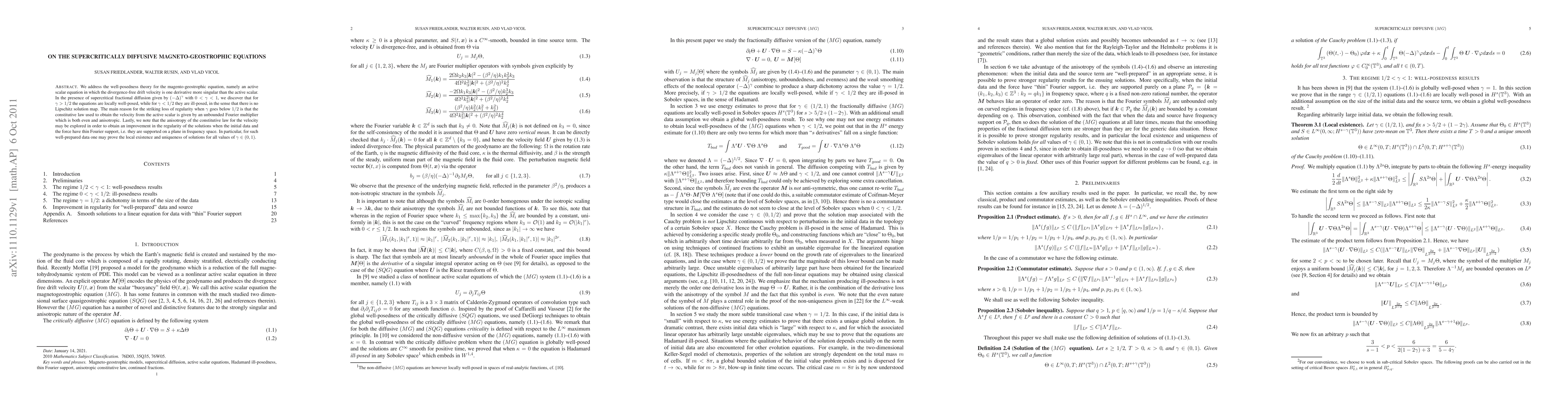 We address the well-posedness theory for the magento-geostrophic equation, namely an active scalar equation in which the divergence-free drift velocity is one derivative more singular than the active scalar. In the presence of supercritical fractional diffusion given by (-\Delta)^\gamma, where 0<\gamma<1, we discover that for \gamma>1/2 the equations are locally well-posed, while for \gamma<1/2 they are ill-posed, in the sense that there is no Lipschitz solution map. The main reason for the striking loss of regularity when \gamma goes below 1/2 is that the constitutive law used to obtain the velocity from the active scalar is given by an unbounded Fourier multiplier which is both even and anisotropic. Lastly, we note that the anisotropy of the constitutive law for the velocity may be explored in order to obtain an improvement in the regularity of the solutions when the initial data and the force have thin Fourier support, i.e. they are supported on a plane in frequency space. In particular, for such well-prepared data one may prove the local existence and uniqueness of solutions for all values of \gamma \in (0,1).