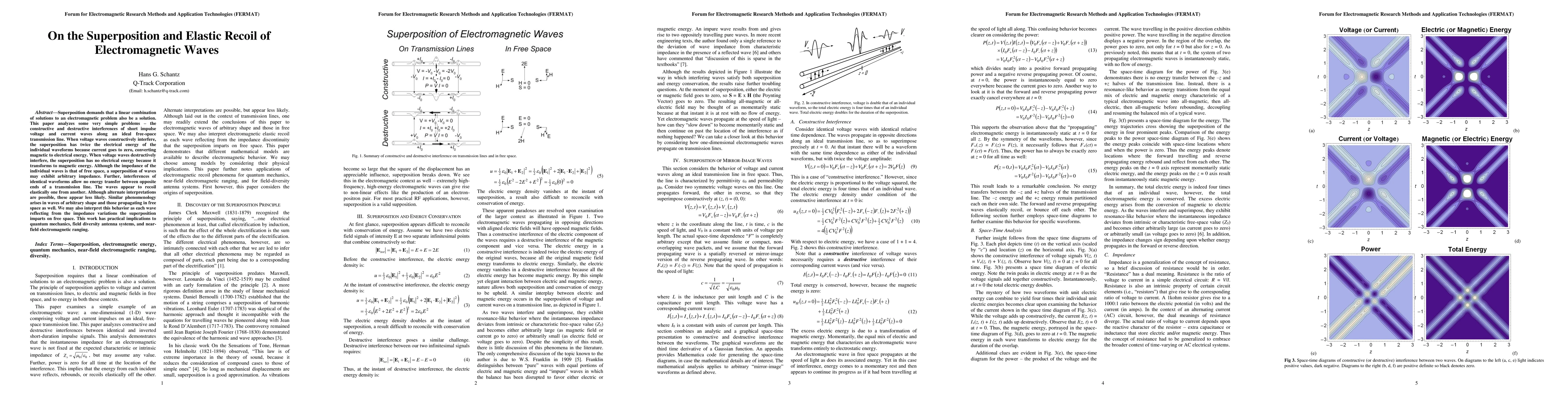 Superposition demands that a linear combination of solutions to an electromagnetic problem also be a solution. This paper analyzes some very simple problems: the constructive and destructive interferences of short impulse voltage and current waves along an ideal free-space transmission line. When voltage waves constructively interfere, the superposition has twice the electrical energy of the individual waveforms because current goes to zero, converting magnetic to electrical energy. When voltage waves destructively interfere, the superposition has no electrical energy because it transforms to magnetic energy. Although the impedance of the individual waves is that of free space, a superposition of waves may exhibit arbitrary impedance. Further, interferences of identical waveforms allow no energy transfer between opposite ends of a transmission line. The waves appear to recoil elastically one from another. Although alternate interpretations are possible, these appear less likely. Similar phenomenology arises in waves of arbitrary shape and those propagating in free space as well. We may also interpret this behavior as each wave reflecting from the impedance variations the superposition imparts on free space. This work has practical implications to quantum mechanics, field diversity antenna systems, and near-field electromagnetic ranging.