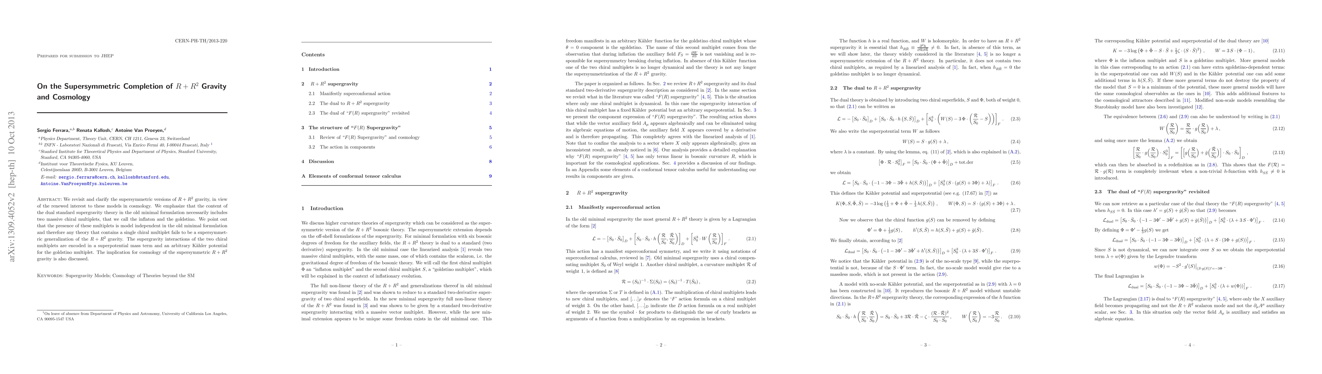 This paper clarifies the supersymmetric completion of $R+ R^2$ gravity, emphasizing that it inherently includes two massive chiral multiplets—the inflaton and the goldstino—in its old minimal formulation. It concludes that any theory with only one chiral multiplet cannot be a supersymmetric generalization of $R+R^2$ gravity.