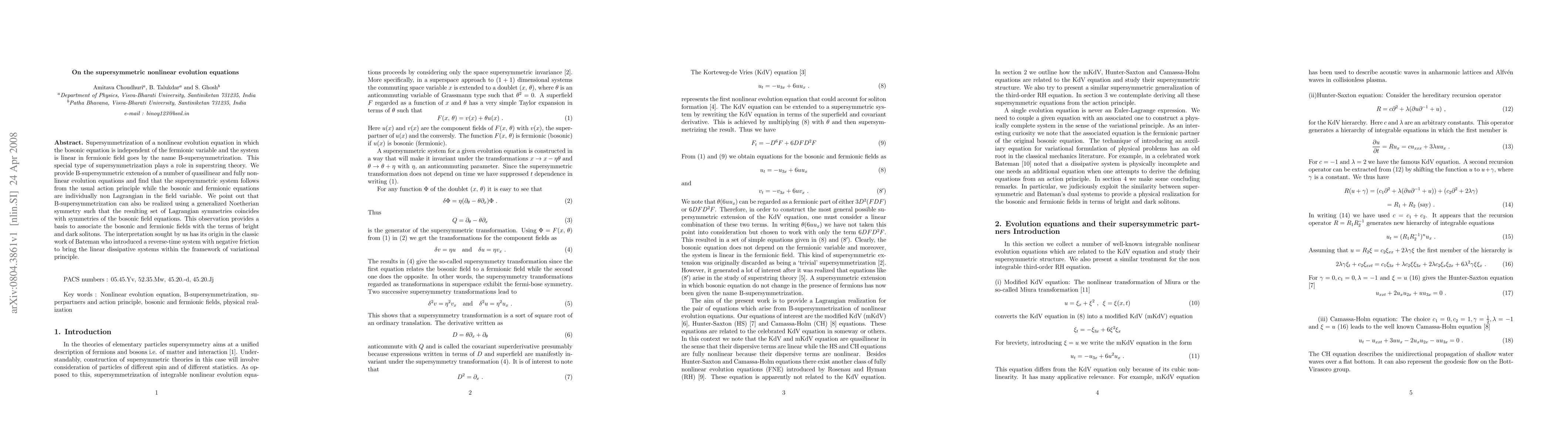 Supersymmetrization of a nonlinear evolution equation in which the bosonic equation is independent of the fermionic variable and the system is linear in fermionic field goes by the name B-supersymmetrization. This special type of supersymmetrization plays a role in superstring theory. We provide B-supersymmetric extension of a number of quasilinear and fully nonlinear evolution equations and find that the supersymmetric system follows from the usual action principle while the bosonic and fermionic equations are individually non Lagrangian in the field variable. We point out that B-supersymmetrization can also be realized using a generalized Noetherian symmetry such that the resulting set of Lagrangian symmetries coincides with symmetries of the bosonic field equations. This observation provides a basis to associate the bosonic and fermionic fields with the terms of bright and dark solitons. The interpretation sought by us has its origin in the classic work of Bateman who introduced a reverse-time system with negative friction to bring the linear dissipative systems within the framework of variational principle.