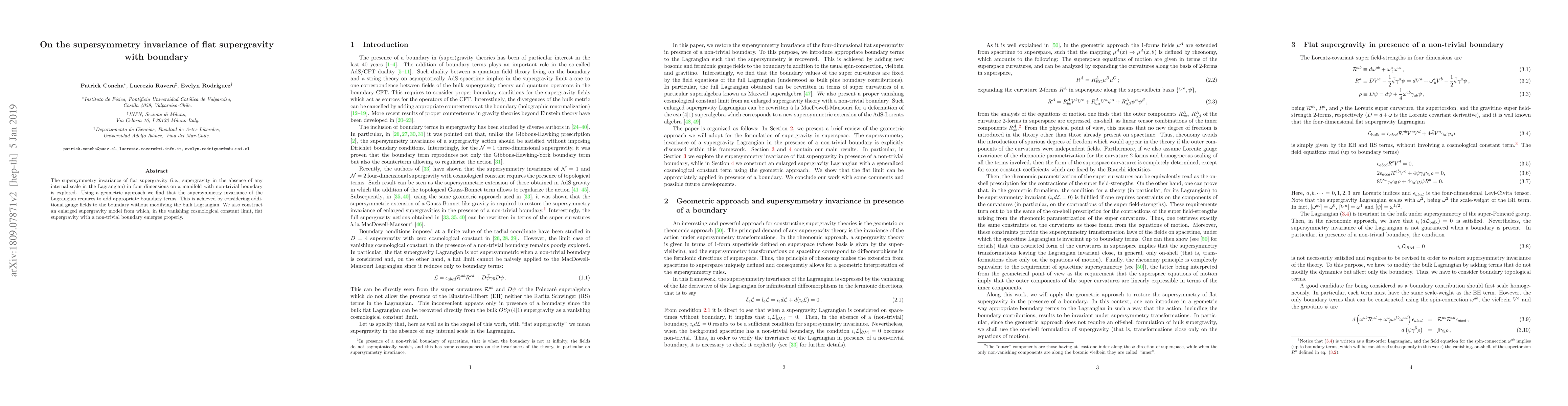 The supersymmetry invariance of flat supergravity (i.e., supergravity in the absence of any internal scale in the Lagrangian) in four dimensions on a manifold with non-trivial boundary is explored. Using a geometric approach we find that the supersymmetry invariance of the Lagrangian requires to add appropriate boundary terms. This is achieved by considering additional gauge fields to the boundary without modifying the bulk Lagrangian. We also construct an enlarged supergravity model from which, in the vanishing cosmological constant limit, flat supergravity with a non-trivial boundary emerges properly.