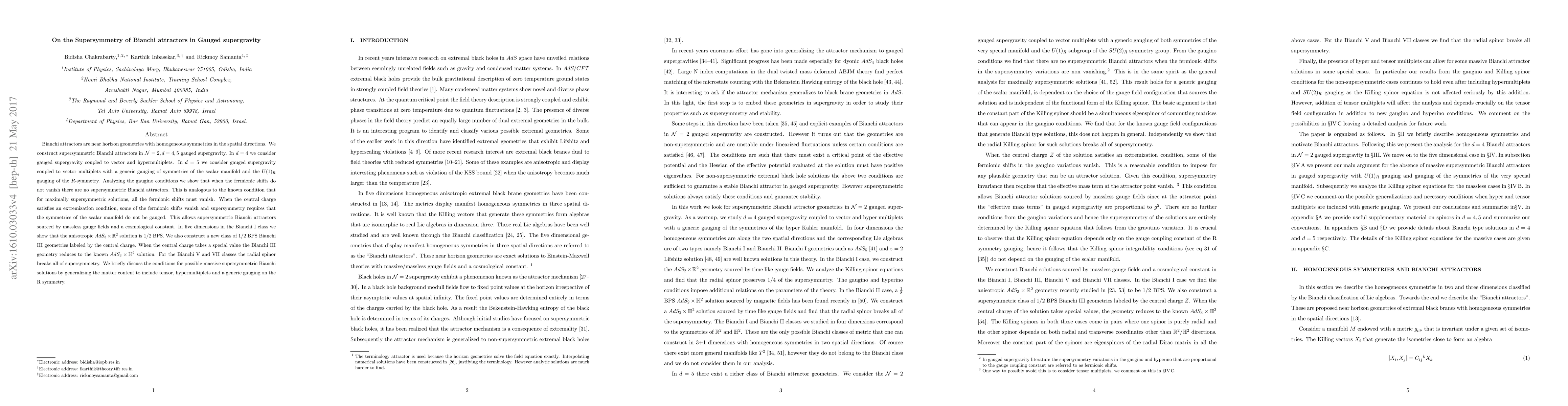 Bianchi attractors are near horizon geometries with homogeneous symmetries in the spatial directions. We construct supersymmetric Bianchi attractors in $\mathcal{N}=2, d=4,5$ gauged supergravity. In $d=4$ we consider gauged supergravity coupled to vector and hypermultiplets. In $d=5$ we consider gauged supergravity coupled to vector multiplets with a generic gauging of symmetries of the scalar manifold and the $U(1)_R$ gauging of the $R$-symmetry. Analyzing the gaugino conditions we show that when the fermionic shifts do not vanish there are no supersymmetric Bianchi attractors. This is analogous to the known condition that for maximally supersymmetric solutions, all the fermionic shifts must vanish. When the central charge satisfies an extremization condition, some of the fermionic shifts vanish and supersymmetry requires that the symmetries of the scalar manifold do not be gauged. This allows supersymmetric Bianchi attractors sourced by massless gauge fields and a cosmological constant. In five dimensions in the Bianchi I class we show that the anisotropic $AdS_3\times\mathbb{R}^2$ solution is $1/2$ BPS. We also construct a new class of $1/2$ BPS Bianchi III geometries labeled by the central charge. When the central charge takes a special value the Bianchi III geometry reduces to the known $AdS_3\times\mathbb{H}^2$ solution. For the Bianchi V and VII classes the radial spinor breaks all of supersymmetry. We briefly discuss the conditions for possible massive supersymmetric Bianchi solutions by generalizing the matter content to include tensor, hypermultiplets and a generic gauging on the R symmetry.