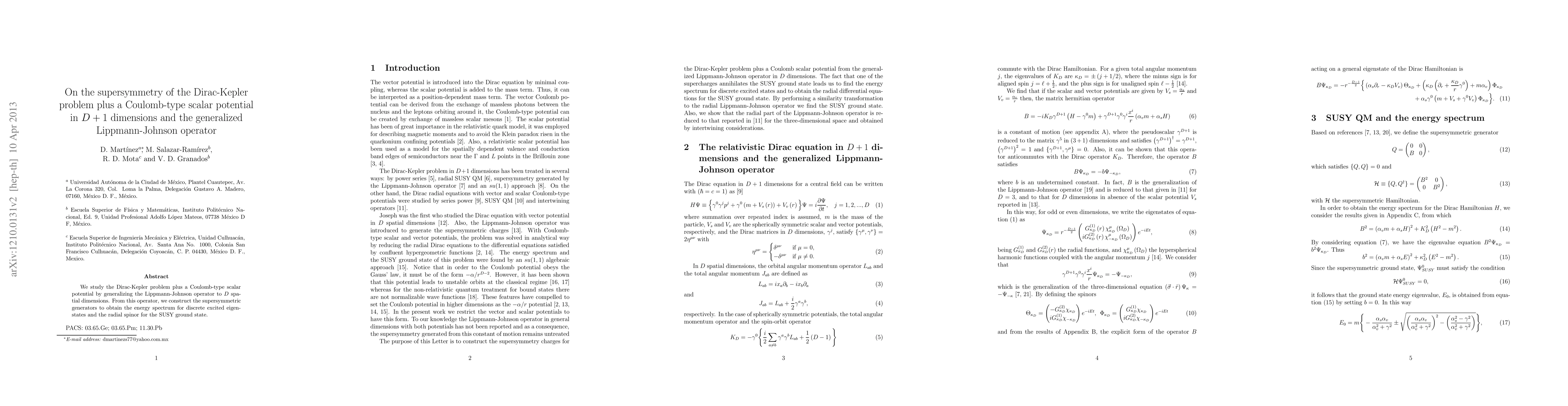 We study the Dirac-Kepler problem plus a Coulomb-type scalar potential by generalizing the Lippmann-Johnson operator to D spatial dimensions. From this operator, we construct the supersymmetric generators to obtain the energy spectrum for discrete excited eigenstates and the radial spinor for the SUSY ground state