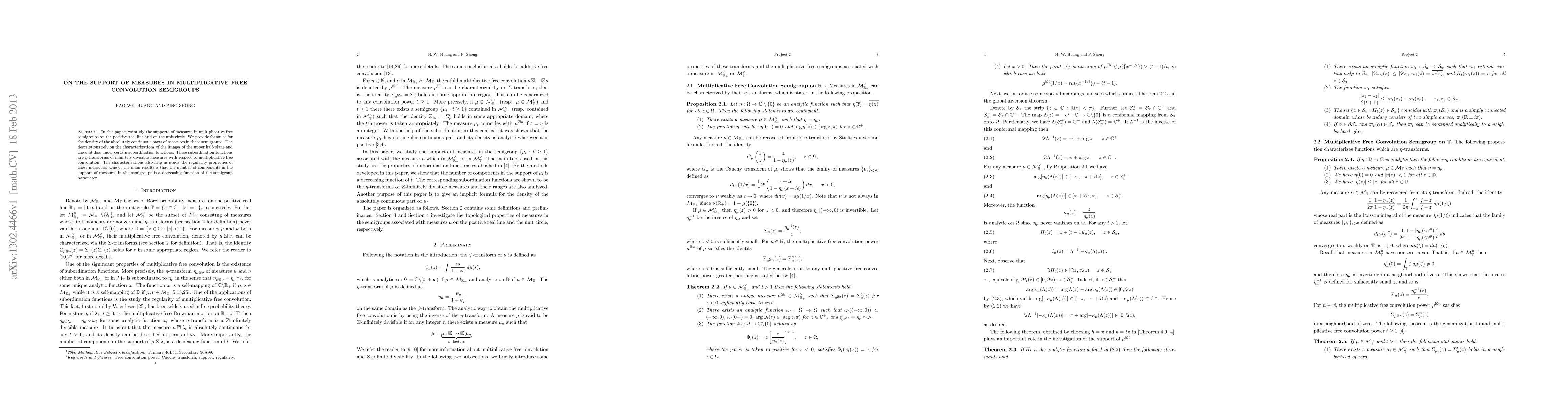 This paper investigates the supports of measures in multiplicative free convolution semigroups on the positive real line and the unit circle, providing formulas for the density of their absolutely continuous parts. It characterizes these measures using subordination functions, revealing that the number of components in their supports decreases with the semigroup parameter.