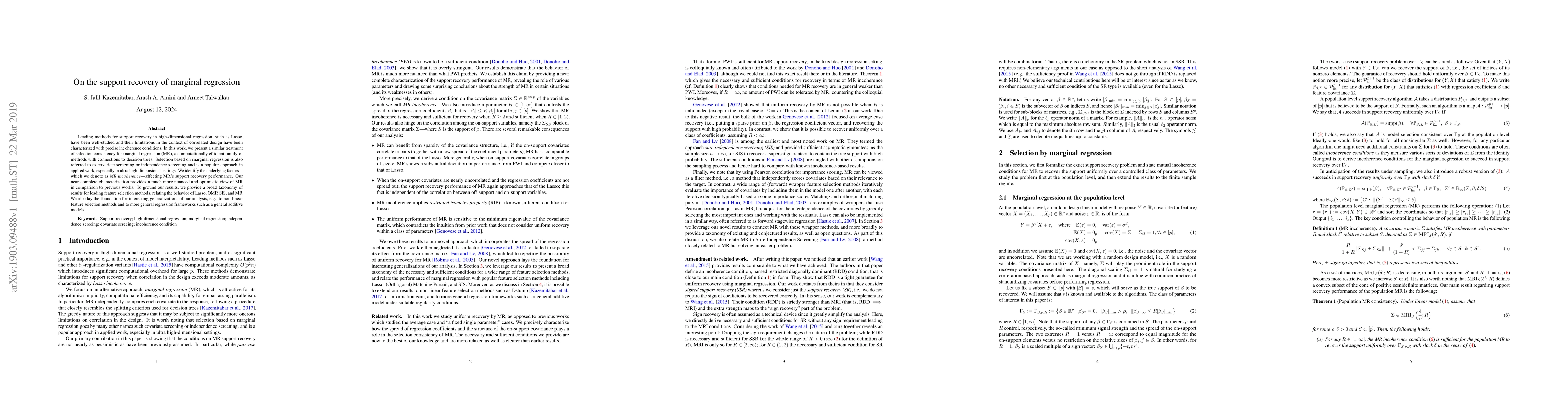 This paper investigates the support recovery performance of marginal regression (MR) in high-dimensional settings, identifying specific "MR incoherence" factors that affect its accuracy. It provides a nuanced characterization of MR's effectiveness compared to Lasso and other methods, laying the groundwork for future generalizations to non-linear and more complex regression frameworks.