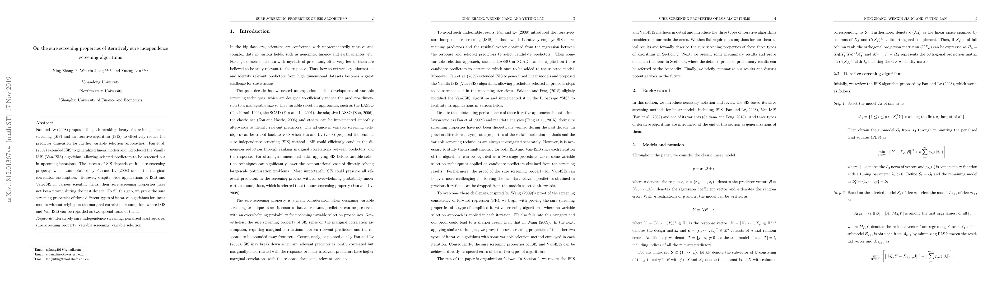 This paper proves the sure screening properties of three iterative sure independence screening algorithms for linear models, extending beyond the marginal correlation assumption. It establishes the theoretical foundation for the effectiveness of these algorithms, including the widely used ISIS and Vanilla ISIS, in reducing predictor dimensions for variable selection.