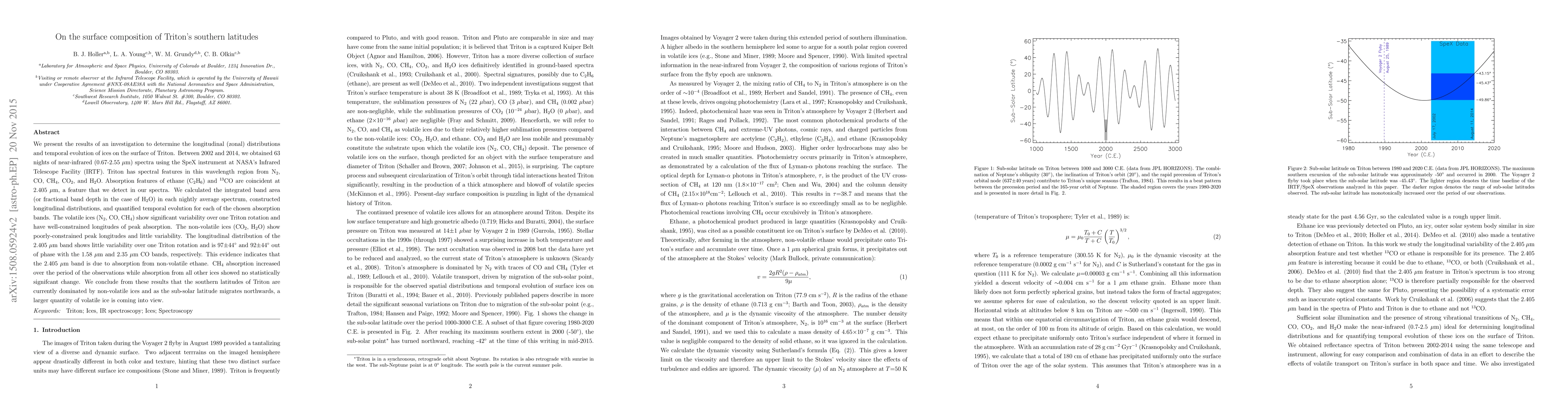 This study reveals that Triton's southern latitudes are dominated by non-volatile ices, with a significant increase in methane absorption over time, as the sub-solar latitude migrates northwards.