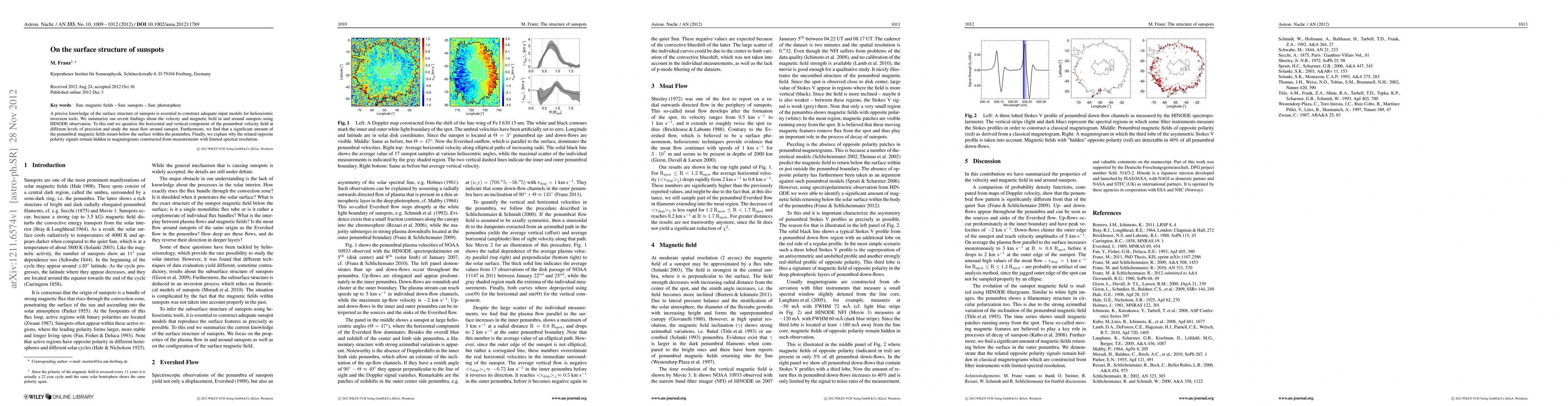 This paper investigates the surface structure of sunspots using HINODE observations, detailing the penumbral velocity field and magnetic field behavior, and explains why opposite polarity signals are often obscured in low-resolution magnetograms. The study highlights the importance of precise models for helioseismic inversions.