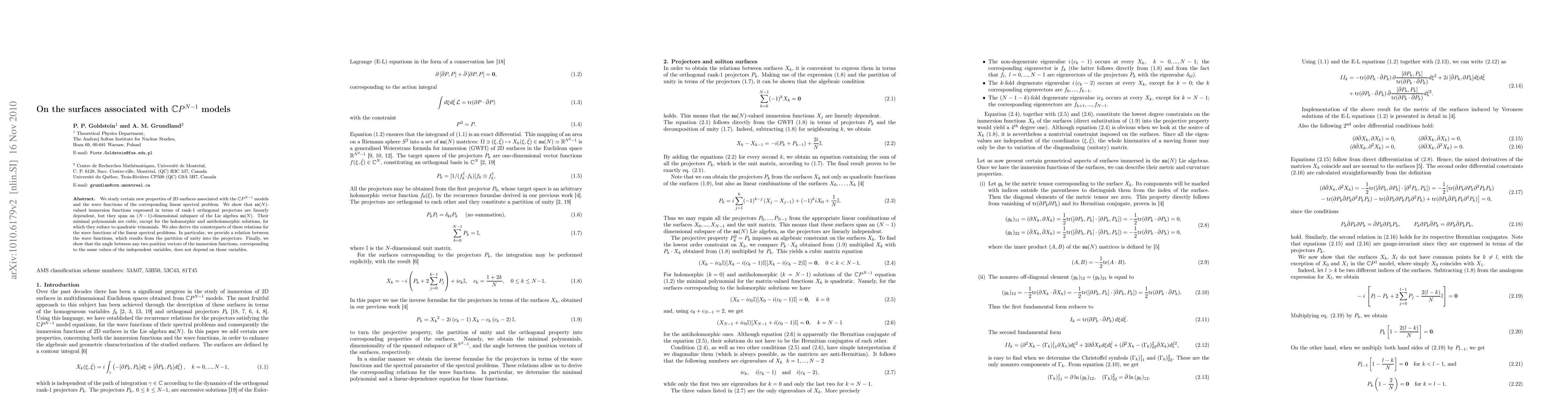 This paper investigates 2D surfaces linked to $\mathbb{C}P^{N-1}$ models and their spectral problems, showing that $su(N)$-valued immersion functions span an $(N-1)$-dimensional subspace of $su(N)$ and have cubic minimal polynomials, except for certain holomorphic and antiholomorphic solutions. It also finds a relation between wave functions derived from unity partition into projectors.