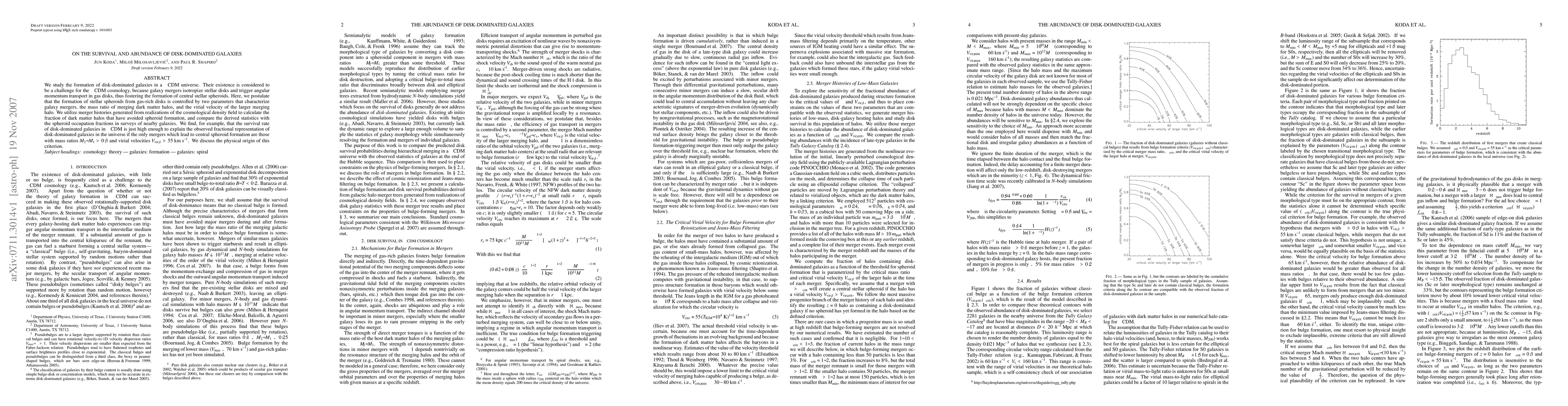 This paper investigates the survival of disk-dominated galaxies in a Lambda CDM cosmology, finding that their persistence is explained by specific merger criteria: mass ratios M2/M1 > 0.3 and virial velocities Vvir,1 > 55 km/s. The study concludes that these conditions prevent the formation of central stellar spheroids, aligning with observed galaxy survey data.