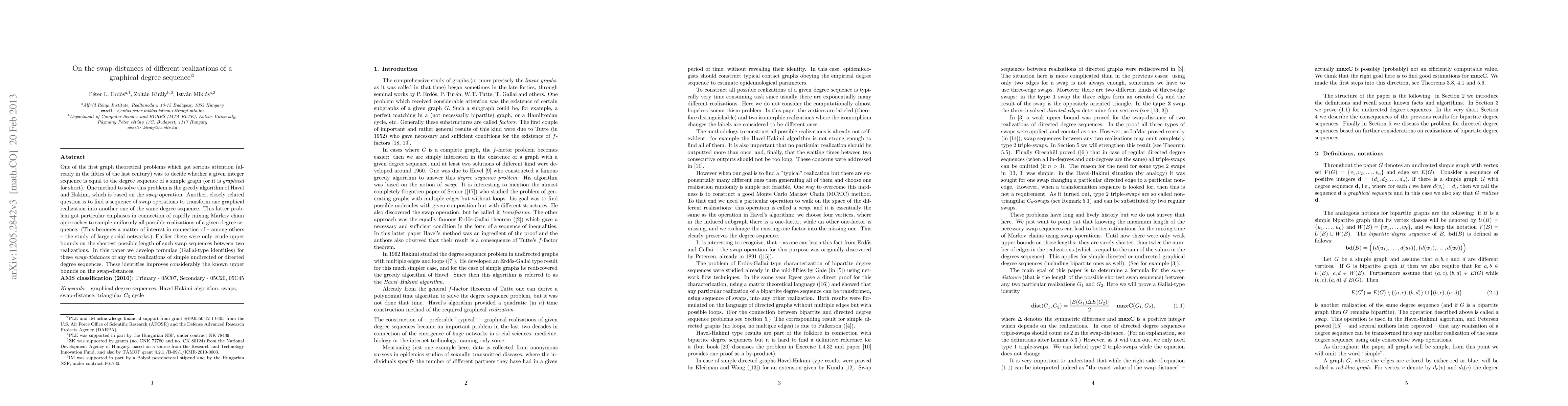 This paper develops new formulae for determining the "swap-distances" between different graphical realizations of the same degree sequence, improving previous upper bounds. These identities are crucial for understanding the complexity of transforming one graphical realization into another, which is important for sampling all possible configurations in large networks.