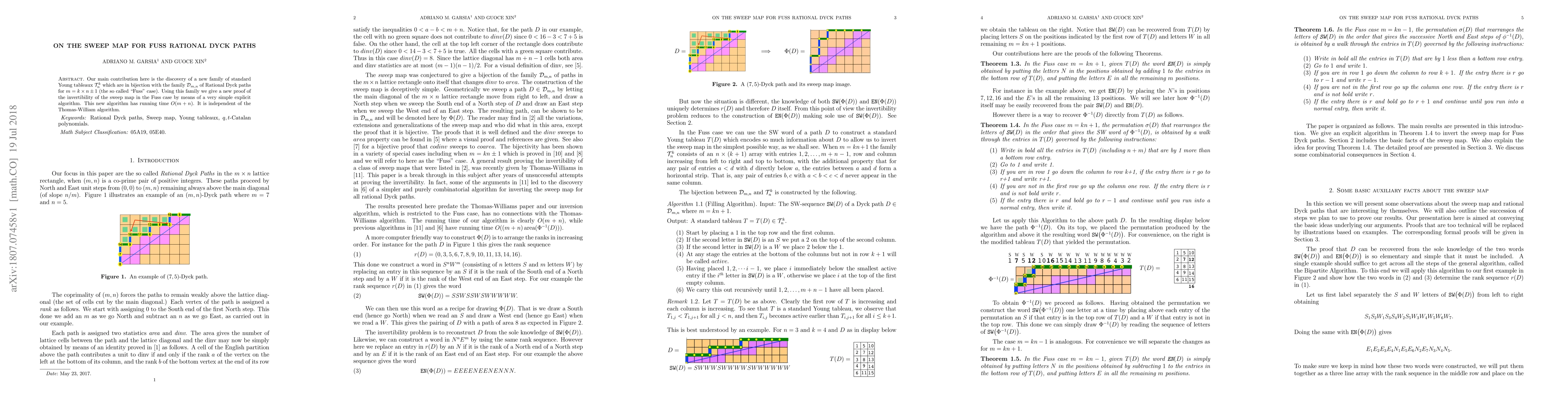 Our main contribution here is the discovery of a new family of standard Young tableaux $ {\cal T}^k_n$ which are in bijection with the family ${\cal D}_{m,n}$ of Rational Dyck paths for $m=k\times n\pm 1$ (the so called "Fuss" case). Using this family we give a new proof of the invertibility of the sweep map in the Fuss case by means of a very simple explicit algorithm. This new algorithm has running time $O(m+n)$. It is independent of the Thomas-William algorithm.
