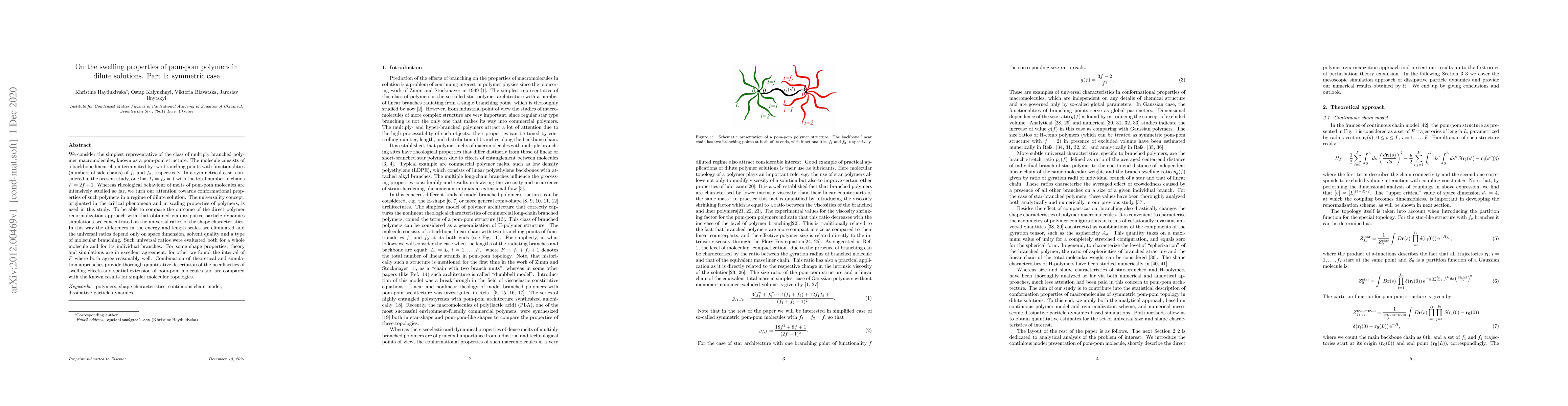 Researchers studied the swelling properties of pom-pom polymers in dilute solutions using theory and simulation methods, finding good agreement on some but not all shape characteristics.