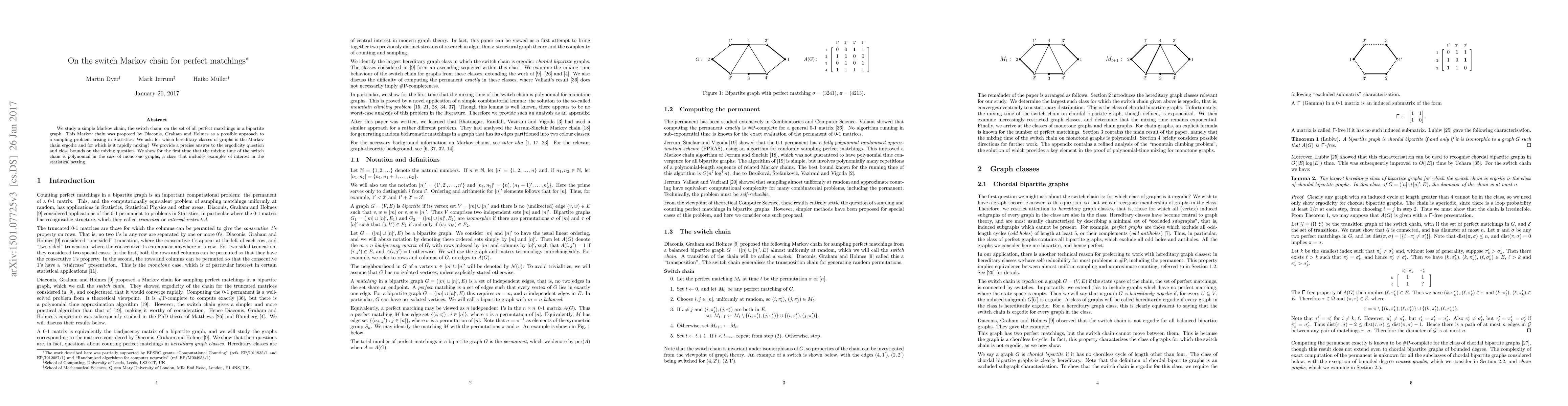 This paper investigates the switch Markov chain for perfect matchings in bipartite graphs, determining when it is ergodic and providing bounds on its mixing time. It establishes that the chain mixes polynomially for monotone graphs, a significant class in statistical applications.