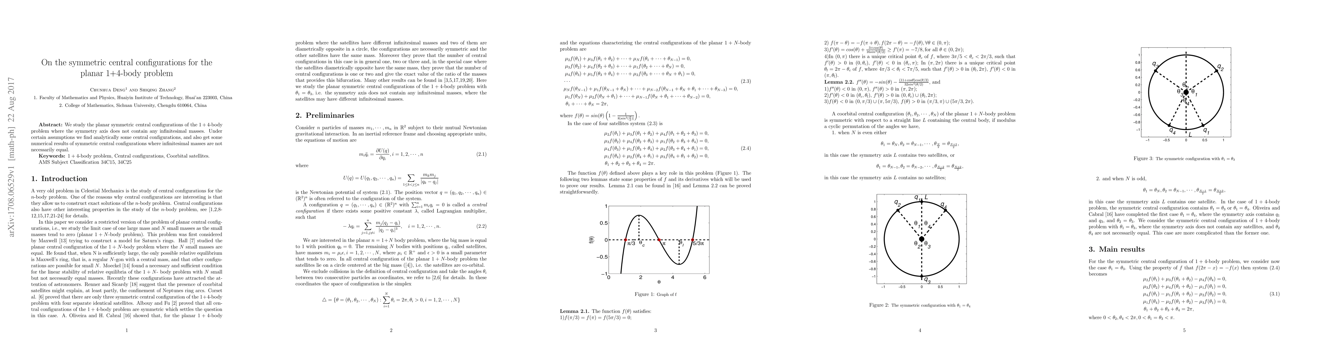 Summary: This paper investigates planar symmetric central configurations in the 1+4-body problem, finding analytical solutions under specific assumptions and obtaining numerical results for configurations where infinitesimal masses may vary.