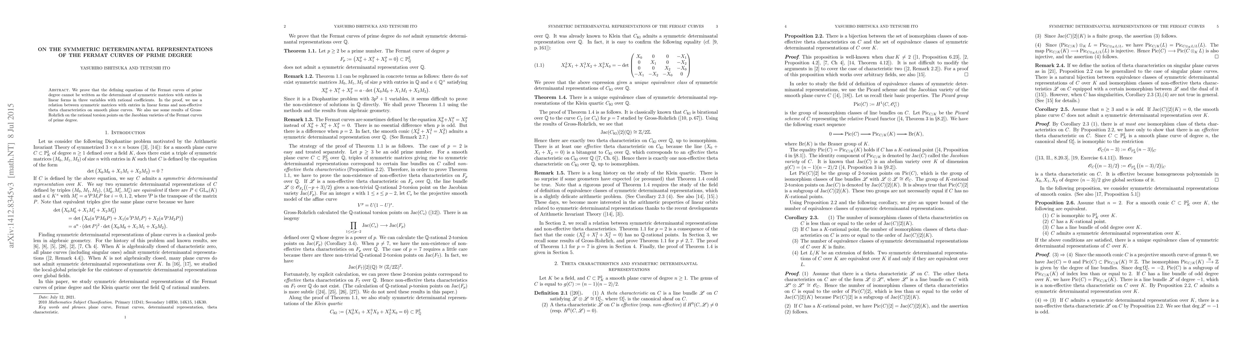This paper proves that Fermat curves of prime degree cannot be represented by symmetric determinantal forms in linear forms with rational coefficients. The proof leverages connections between symmetric matrices and non-effective theta characteristics, along with results on rational torsion points from Gross-Rohrlich.