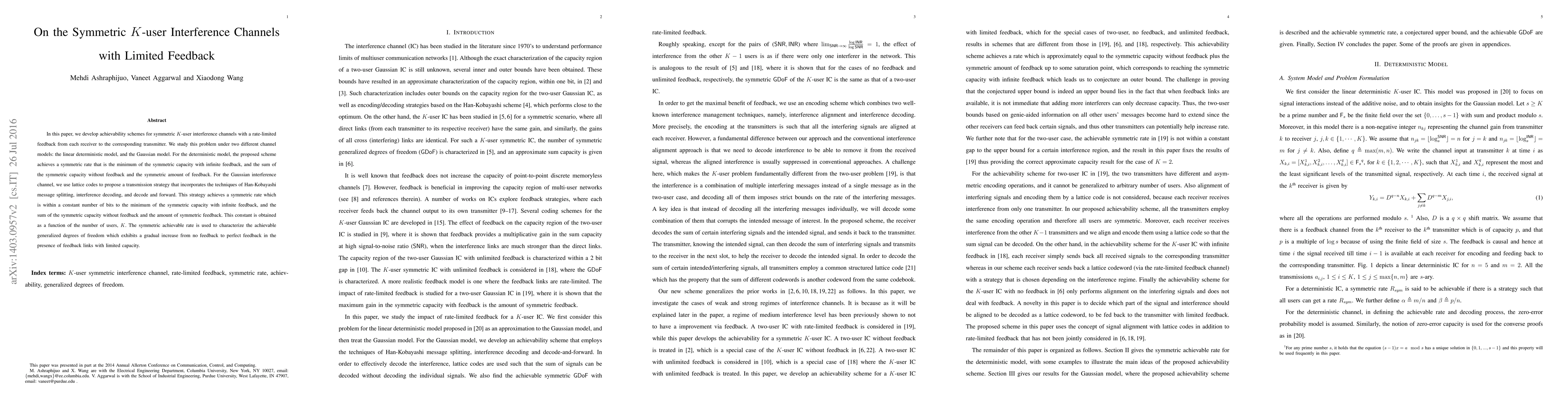 This paper proposes achievability schemes for symmetric $K$-user interference channels under limited feedback, achieving rates close to symmetric capacities in both deterministic and Gaussian models. The schemes involve lattice codes and Han-Kobayashi techniques, demonstrating a gradual increase in achievable generalized degrees of freedom with feedback capacity.