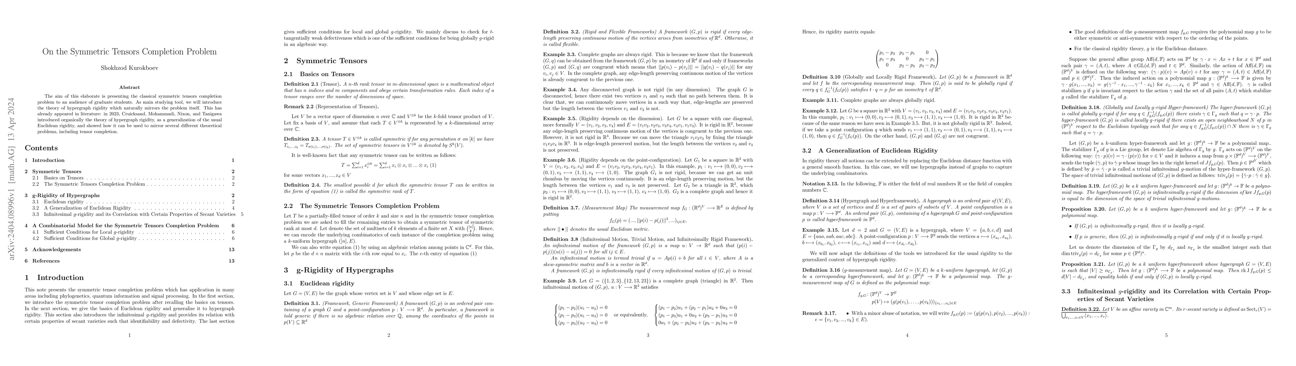 This paper introduces the symmetric tensors completion problem and utilizes hypergraph rigidity theory to provide a new perspective. The authors draw on recent work by Cruickshank et al. (2023) that generalizes Euclidean rigidity to tensor completion.