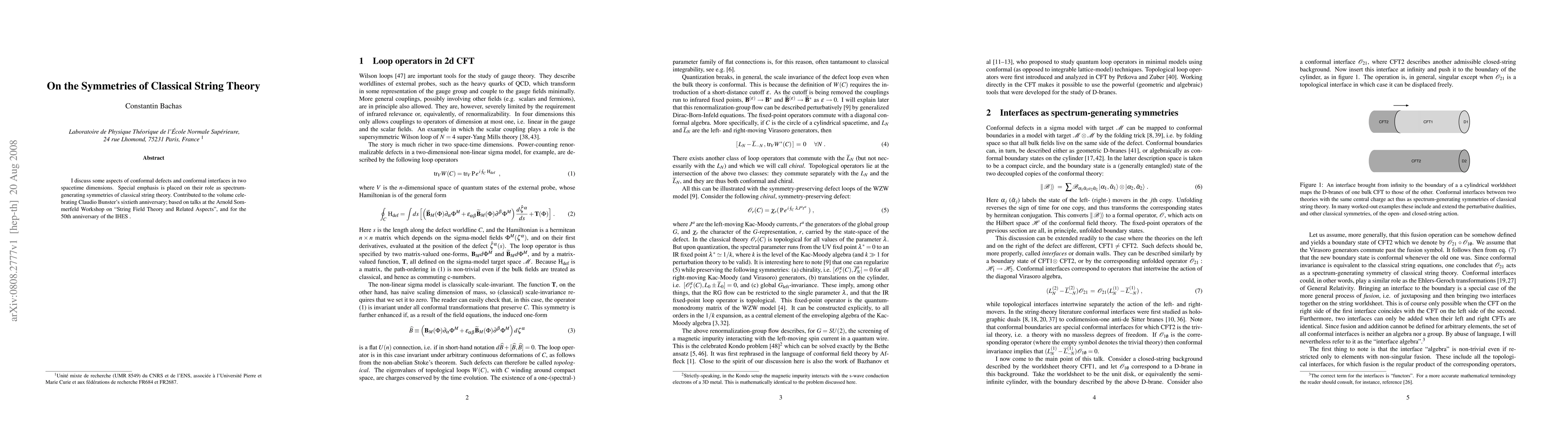 I discuss some aspects of conformal defects and conformal interfaces in two spacetime dimensions. Special emphasis is placed on their role as spectrum-generating symmetries of classical string theory.
