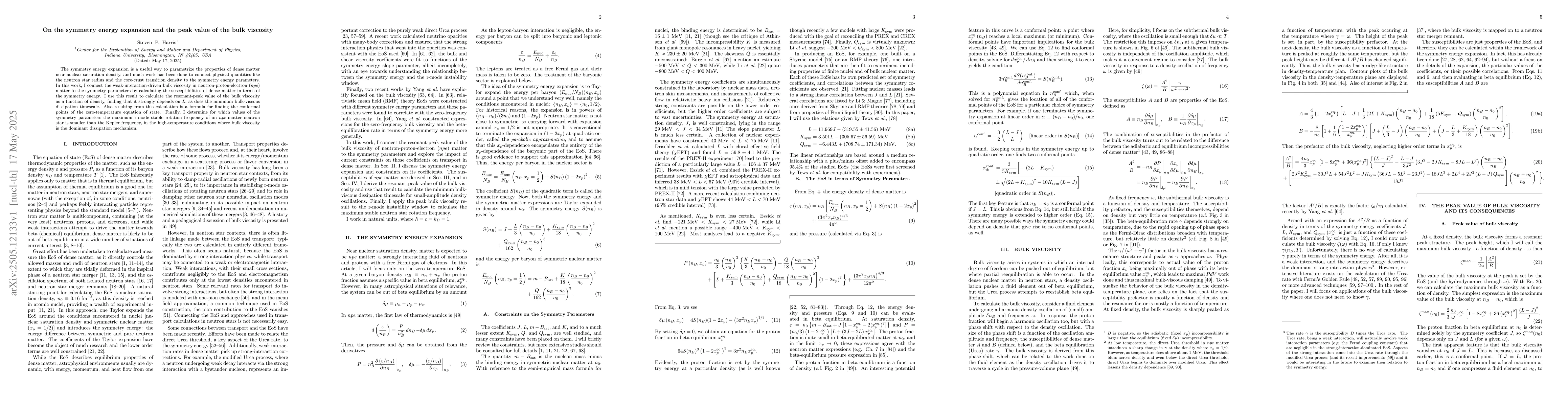 The research calculates the susceptibilities of dense matter in terms of the symmetry energy and uses this to find the resonant-peak value of the bulk viscosity as a function of density, along with the minimum bulk-viscous dissipation timescale. It also derives a formula for conformal points of the zero-temperature equation of state and determines conditions for r-mode stable rotation frequency of neutron stars.