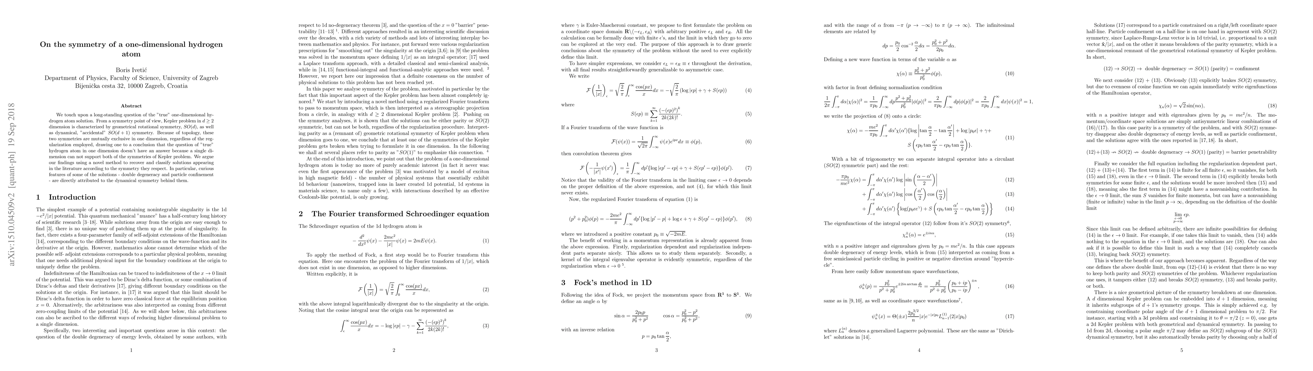 This paper investigates the symmetry properties of a hypothetical one-dimensional hydrogen atom, concluding that it cannot support the dual symmetries of the Kepler problem due to topological constraints. The authors use a novel method to classify existing solutions based on their symmetry, attributing features like double degeneracy to the dynamical symmetry.