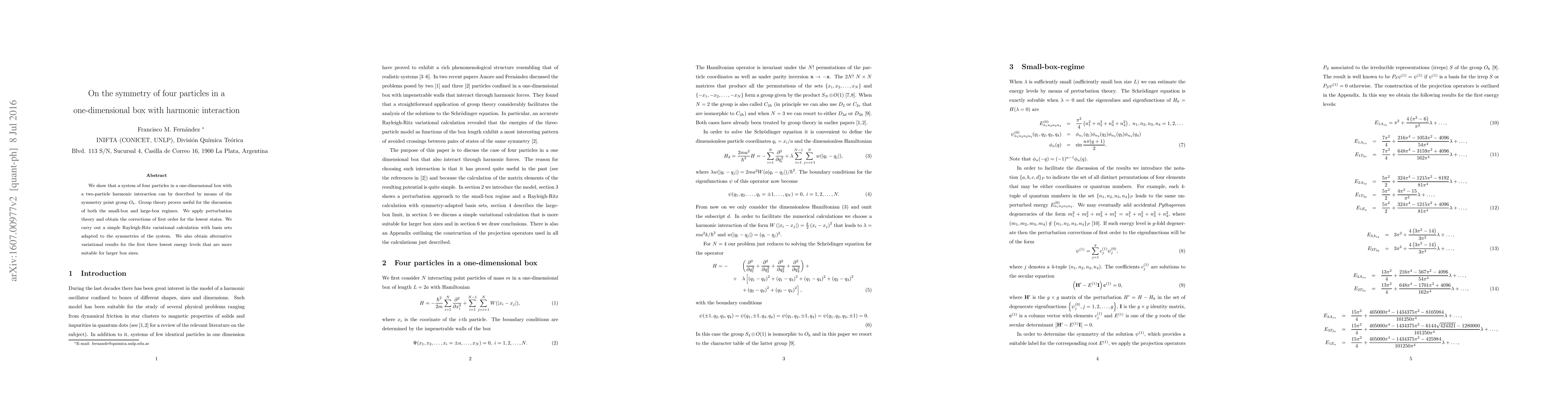 We show that a system of four particles in a one-dimensional box with a two-particle harmonic interaction can by described by means of the symmetry point group $O_h$. Group theory proves useful for the discussion of both the small-box and large-box regimes. We apply perturbation theory and obtain the corrections of first order for the lowest states. We carry out a simple Rayleigh-Ritz variational calculation with basis sets adapted to the symmetries of the system. We also obtain alternative variational results for the first three lowest energy levels that are more suitable for larger box sizes.