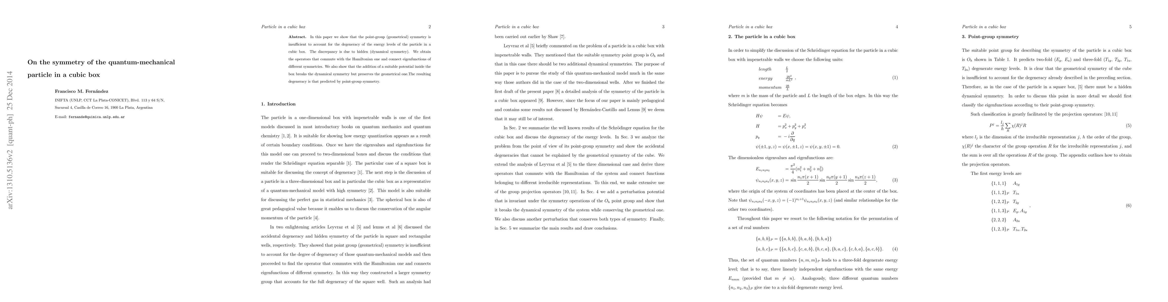 In this paper we show that the point-group (geometrical) symmetry is insufficient to account for the degeneracy of the energy levels of the particle in a cubic box. The discrepancy is due to hidden (dynamical symmetry). We obtain the operators that commute with the Hamiltonian one and connect eigenfunctions of different symmetries. We also show that the addition of a suitable potential inside the box breaks the dynamical symmetry but preserves the geometrical one.The resulting degeneracy is that predicted by point-group symmetry.