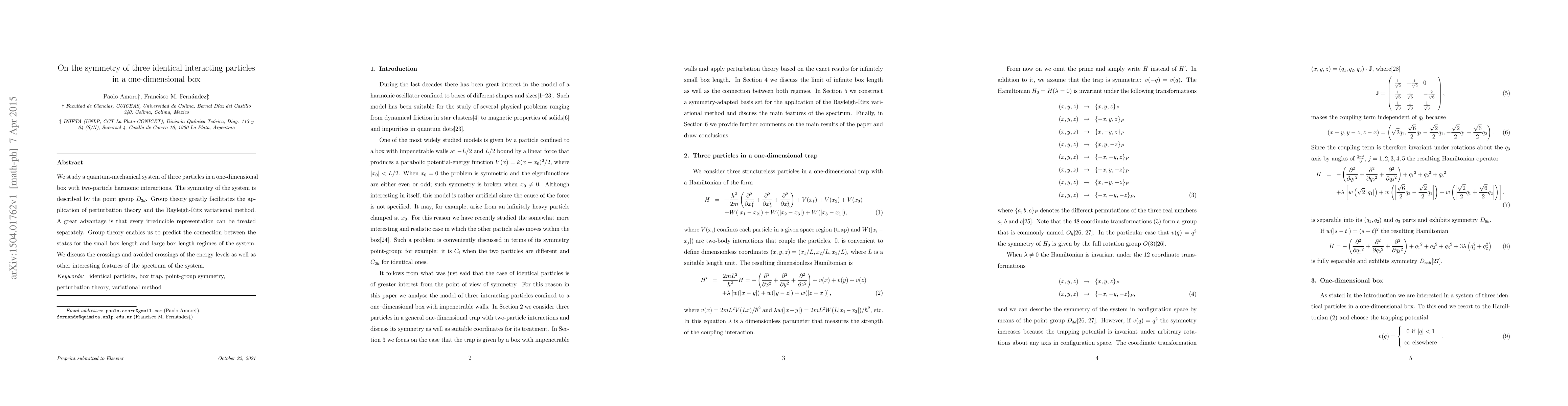 We study a quantum-mechanical system of three particles in a one-dimensional box with two-particle harmonic interactions. The symmetry of the system is described by the point group $D_{3d}$. Group theory greatly facilitates the application of perturbation theory and the Rayleigh-Ritz variational method. A great advantage is that every irreducible representation can be treated separately. Group theory enables us to predict the connection between the states for the small box length and large box length regimes of the system. We discuss the crossings and avoided crossings of the energy levels as well as other interesting features of the spectrum of the system.