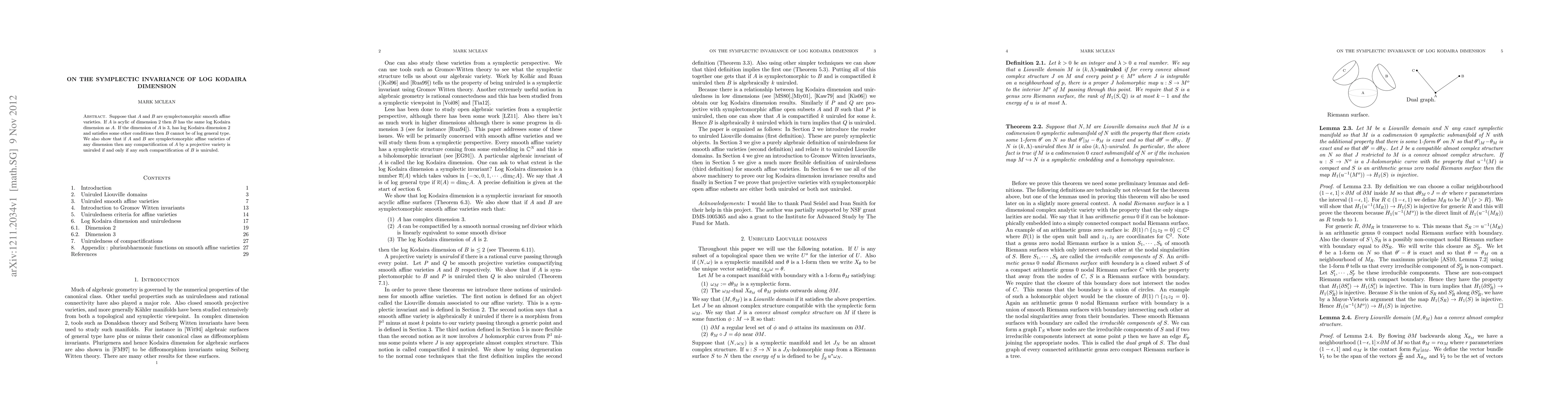 Suppose that A and B are symplectomorphic smooth affine varieties. If A is acylic of dimension 2 then B has the same log Kodaira dimension as A. If the dimension of A is 3, has log Kodaira dimension 2 and satisfies some other conditions then B cannot be of log general type. We also show that if A and B are symplectomorphic affine varieties of any dimension then any compactification of A by a projective variety is uniruled if and only if any such compactification of B is uniruled.