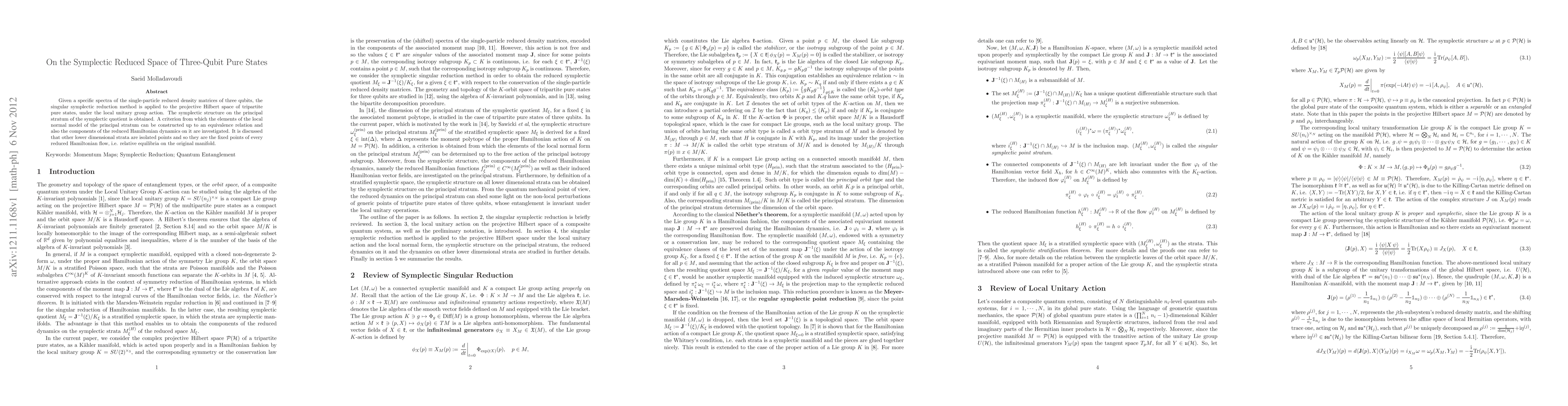 Given a specific spectra of the single-particle reduced density matrices of three qubits, the singular symplectic reduction method is applied to the projective Hilbert space of tripartite pure states, under the local unitary group action. The symplectic structure on the principal stratum of the symplectic quotient is obtained. A criterion from which the elements of the local normal model of the principal stratum can be constructed up to an equivalence relation and also the components of the reduced Hamiltonian dynamics on it are investigated. It is discussed that other lower dimensional strata are isolated points and so they are the fixed points of every reduced Hamiltonian flow, i.e. relative equilibria on the original manifold.